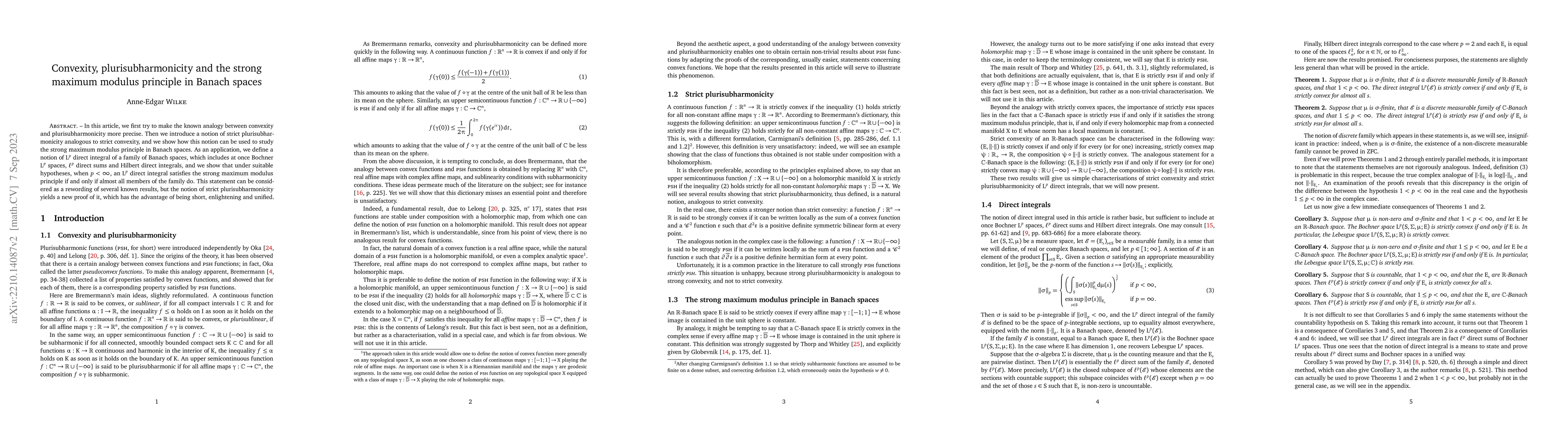 In this article, we first try to make the known analogy between convexity and plurisubharmonicity more precise. Then we introduce a notion of strict plurisubharmonicity analogous to strict convexity, and we show how this notion can be used to study the strong maximum modulus principle in Banach spaces. As an application, we define a notion of $L^p$ direct integral of a family of Banach spaces, which includes at once Bochner $L^p$ spaces, $\ell^p$ direct sums and Hilbert direct integrals, and we show that under suitable hypotheses, when $p < \infty$, an $L^p$ direct integral satisfies the strong maximum modulus principle if and only if almost all members of the family do. This statement can be considered as a rewording of several known results, but the notion of strict plurisubharmonicity yields a new proof of it, which has the advantage of being short, enlightening and unified.
