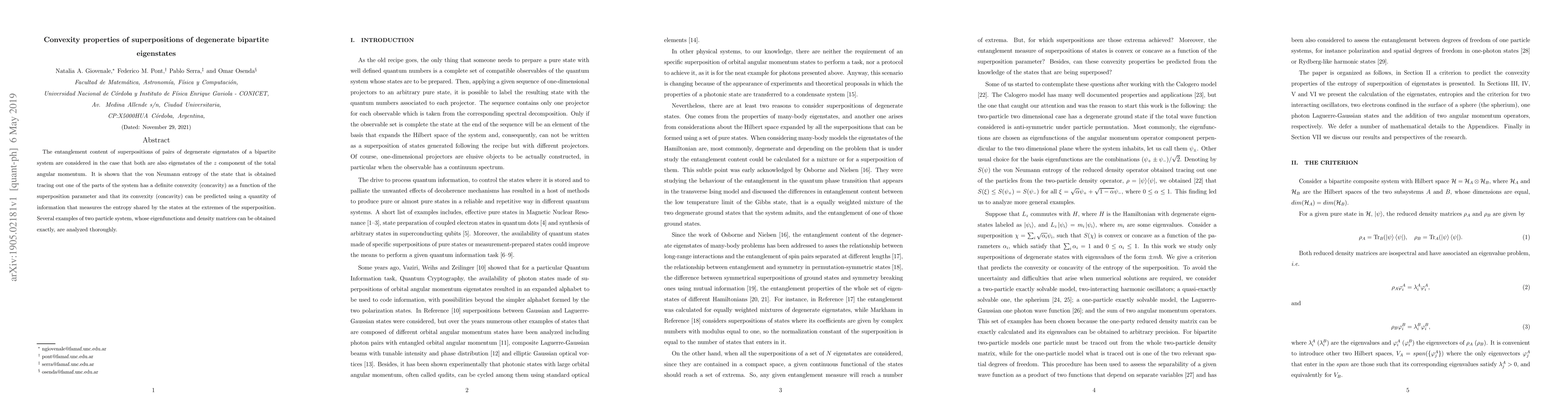 The entanglement content of superpositions of pairs of degenerate eigenstates of a bipartite system are considered in the case that both are also eigenstates of the $z$ component of the total angular momentum. It is shown that the von Neumann entropy of the state that is obtained tracing out one of the parts of the system has a definite convexity (concavity) as a function of the superposition parameter and that its convexity (concavity) can be predicted using a quantity of information that measures the entropy shared by the states at the extremes of the superposition. Several examples of two particle system, whose eigenfunctions and density matrices can be obtained exactly, are analyzed thoroughly.