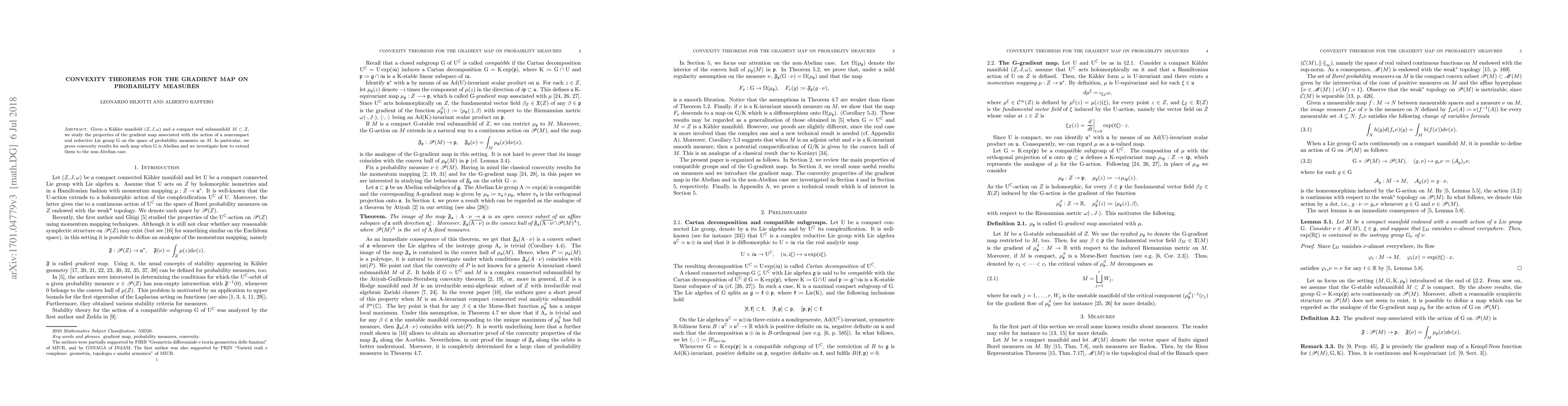The paper investigates convexity results for a gradient map on probability measures associated with an action of a real reductive Lie group on a compact K"ahler manifold, focusing on the Abelian case and exploring extensions to non-Abelian cases.