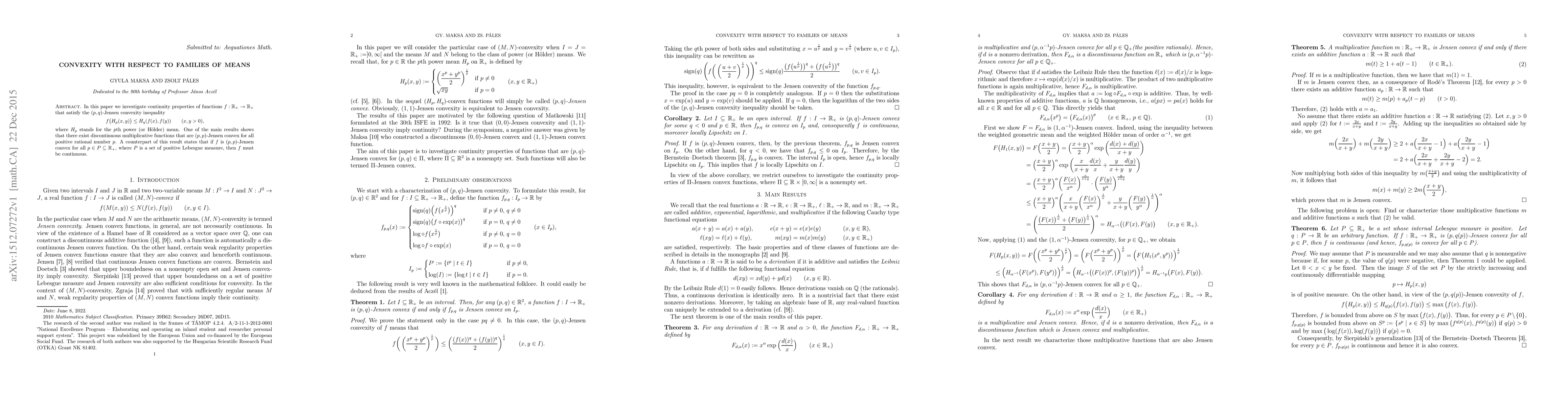 This paper explores functions f(x) that meet the (p,q)-Jensen convexity inequality involving power means. A key finding is that some discontinuous multiplicative functions can still satisfy this inequality for all positive rational p. Conversely, if a function satisfies the inequality for all p in a set P of positive Lebesgue measure, it must be continuous.