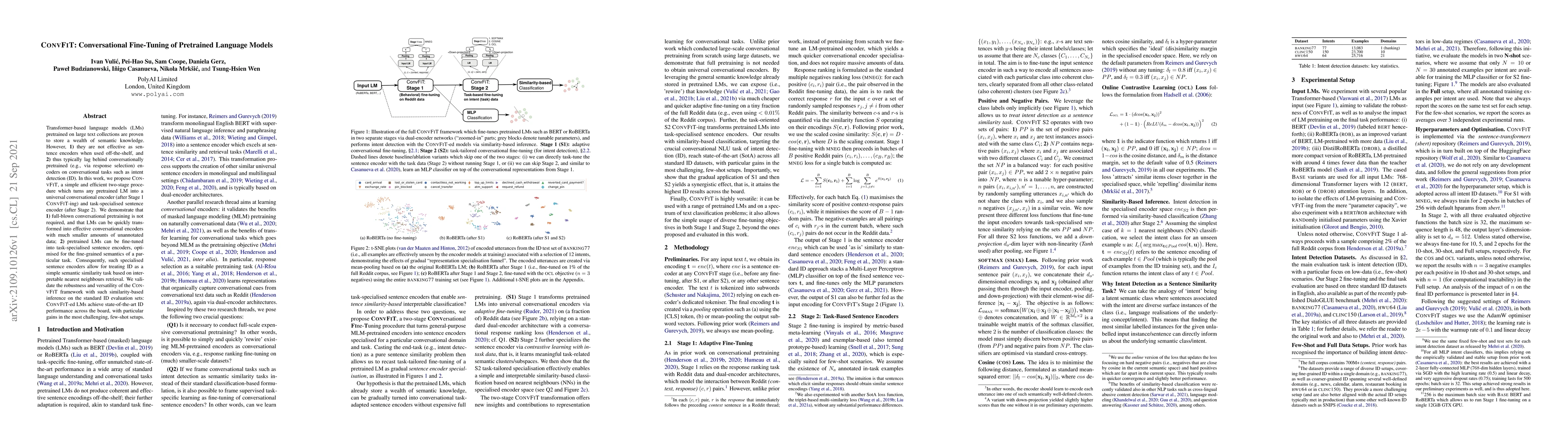 Transformer-based language models (LMs) pretrained on large text collections are proven to store a wealth of semantic knowledge. However, 1) they are not effective as sentence encoders when used off-the-shelf, and 2) thus typically lag behind conversationally pretrained (e.g., via response selection) encoders on conversational tasks such as intent detection (ID). In this work, we propose ConvFiT, a simple and efficient two-stage procedure which turns any pretrained LM into a universal conversational encoder (after Stage 1 ConvFiT-ing) and task-specialised sentence encoder (after Stage 2). We demonstrate that 1) full-blown conversational pretraining is not required, and that LMs can be quickly transformed into effective conversational encoders with much smaller amounts of unannotated data; 2) pretrained LMs can be fine-tuned into task-specialised sentence encoders, optimised for the fine-grained semantics of a particular task. Consequently, such specialised sentence encoders allow for treating ID as a simple semantic similarity task based on interpretable nearest neighbours retrieval. We validate the robustness and versatility of the ConvFiT framework with such similarity-based inference on the standard ID evaluation sets: ConvFiT-ed LMs achieve state-of-the-art ID performance across the board, with particular gains in the most challenging, few-shot setups.