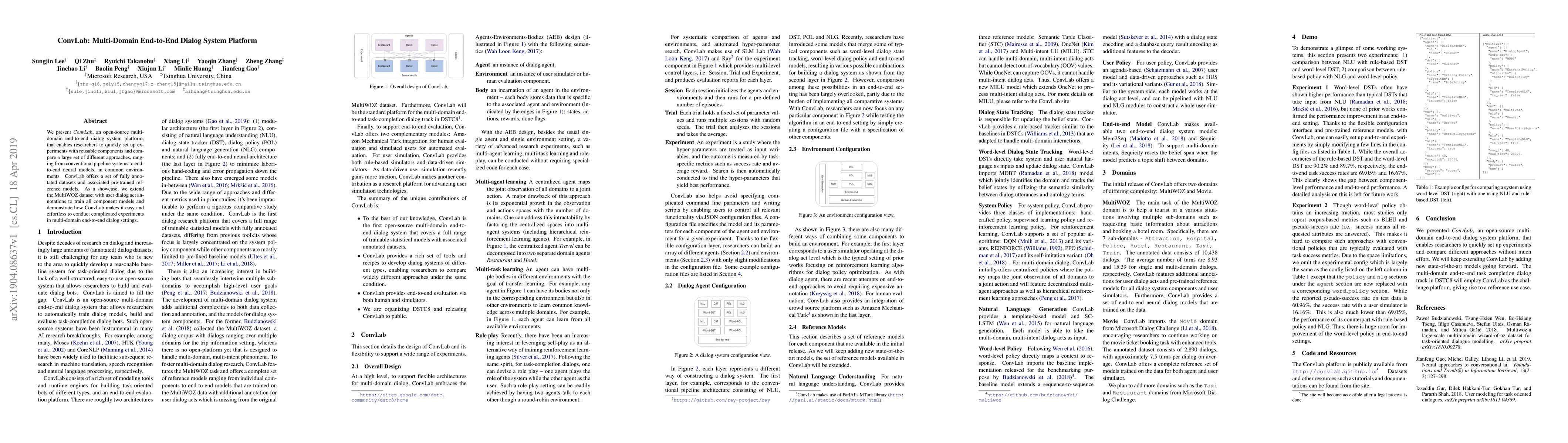 ConvLab is an open-source platform for multi-domain dialog systems that allows researchers to experiment with both traditional and neural models, providing reusable components, annotated datasets, and pre-trained models. It facilitates complex multi-domain dialog experiments by extending datasets like MultiWOZ.
