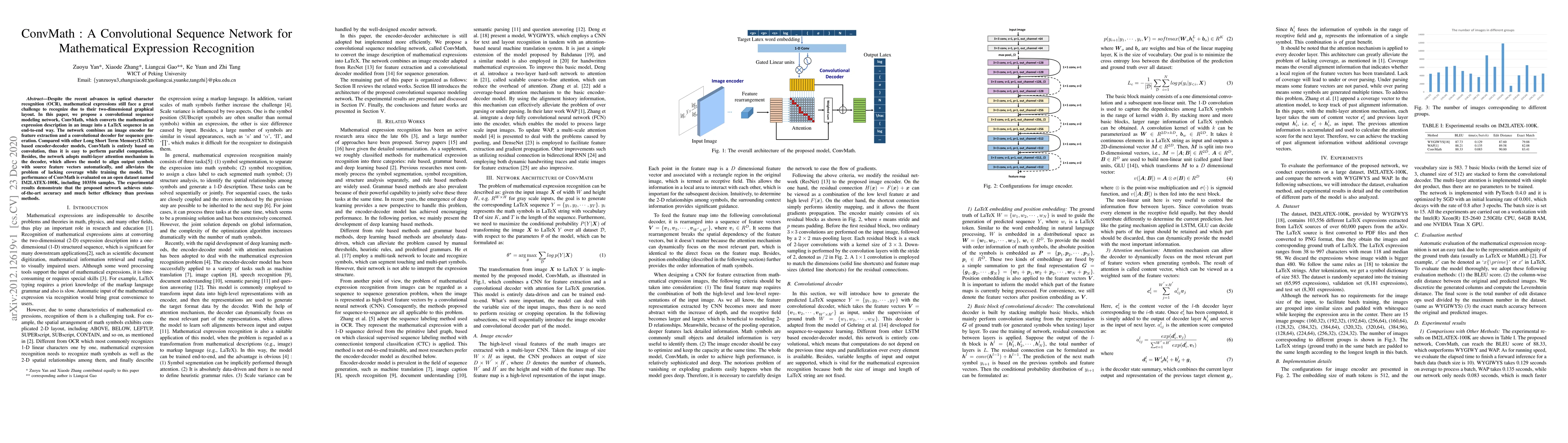 Despite the recent advances in optical character recognition (OCR), mathematical expressions still face a great challenge to recognize due to their two-dimensional graphical layout. In this paper, we propose a convolutional sequence modeling network, ConvMath, which converts the mathematical expression description in an image into a LaTeX sequence in an end-to-end way. The network combines an image encoder for feature extraction and a convolutional decoder for sequence generation. Compared with other Long Short Term Memory(LSTM) based encoder-decoder models, ConvMath is entirely based on convolution, thus it is easy to perform parallel computation. Besides, the network adopts multi-layer attention mechanism in the decoder, which allows the model to align output symbols with source feature vectors automatically, and alleviates the problem of lacking coverage while training the model. The performance of ConvMath is evaluated on an open dataset named IM2LATEX-100K, including 103556 samples. The experimental results demonstrate that the proposed network achieves state-of-the-art accuracy and much better efficiency than previous methods.