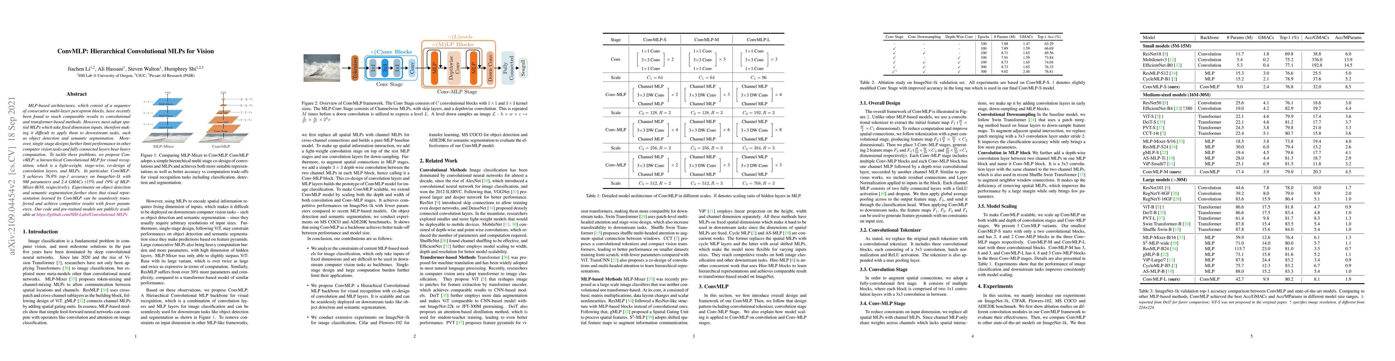 ConvMLP: a hierarchical architecture combining convolutional and multi-layer perceptron layers achieves 76.8% top-1 accuracy on ImageNet-1k with fewer parameters than comparable methods.