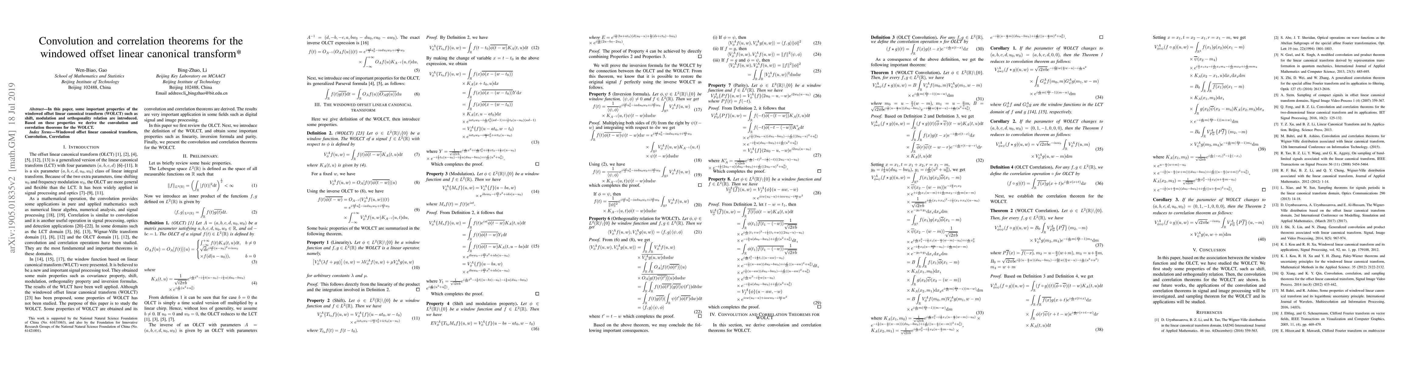 This paper introduces key properties of the windowed offset linear canonical transform (WOLCT), including shift, modulation, and orthogonality. It then derives the convolution and correlation theorems based on these properties.