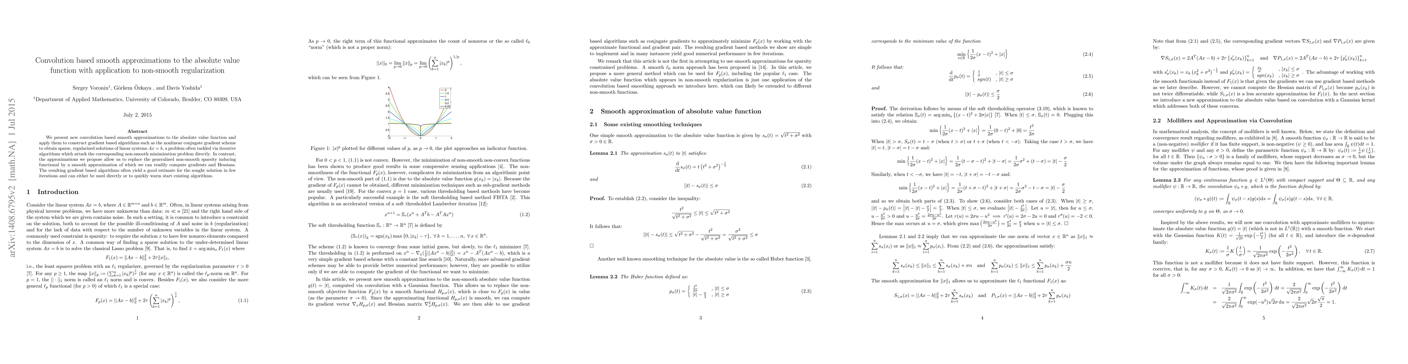We present new convolution based smooth approximations to the absolute value function and apply them to construct gradient based algorithms such as the nonlinear conjugate gradient scheme to obtain sparse, regularized solutions of linear systems $Ax = b$, a problem often tackled via iterative algorithms which attack the corresponding non-smooth minimization problem directly. In contrast, the approximations we propose allow us to replace the generalized non-smooth sparsity inducing functional by a smooth approximation of which we can readily compute gradients and Hessians. The resulting gradient based algorithms often yield a good estimate for the sought solution in few iterations and can either be used directly or to quickly warm start existing algorithms.