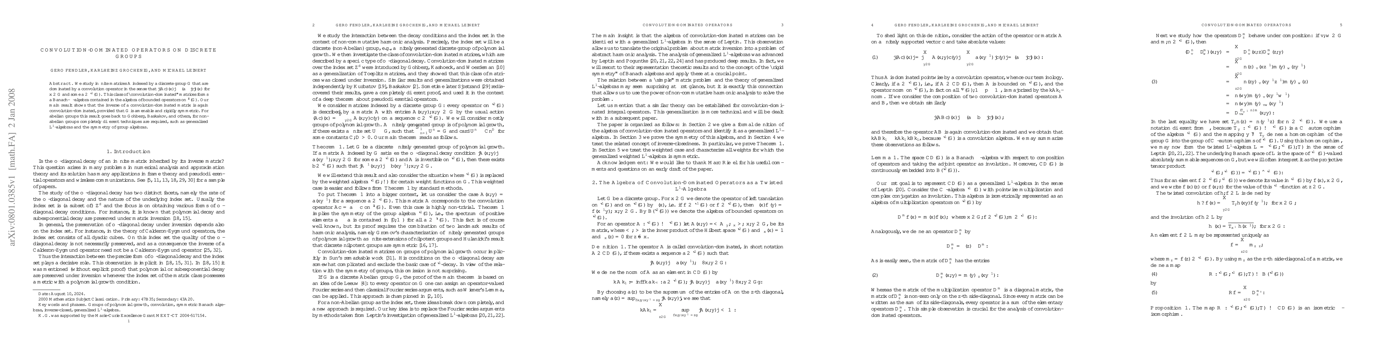 This paper investigates infinite matrices dominated by convolution operators on discrete groups, establishing that such "convolution-dominated" matrices form a Banach-*-algebra. The main result proves the invertibility of these matrices under the conditions of amenability and rigidity symmetry of the group.