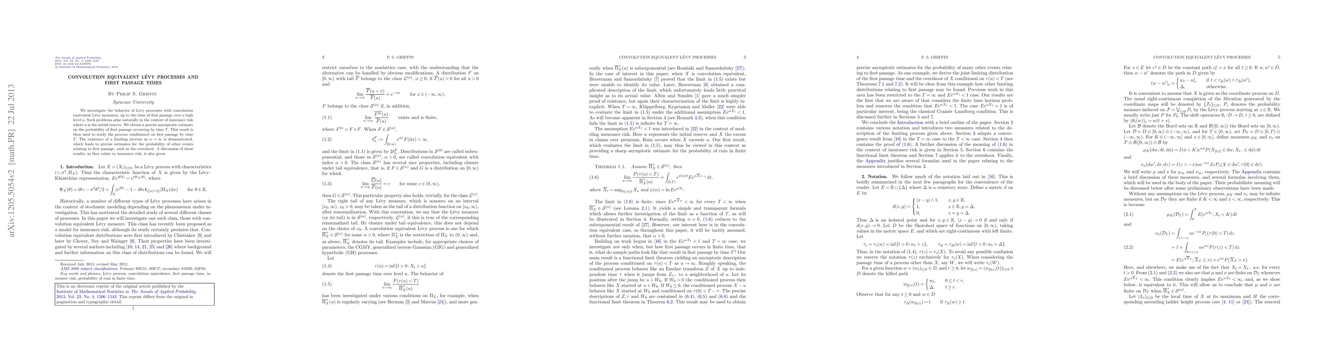The paper presents a detailed analysis of first passage times for Lévy processes with convolution equivalent Lévy measures, providing new asymptotic estimates and a limiting process description.
