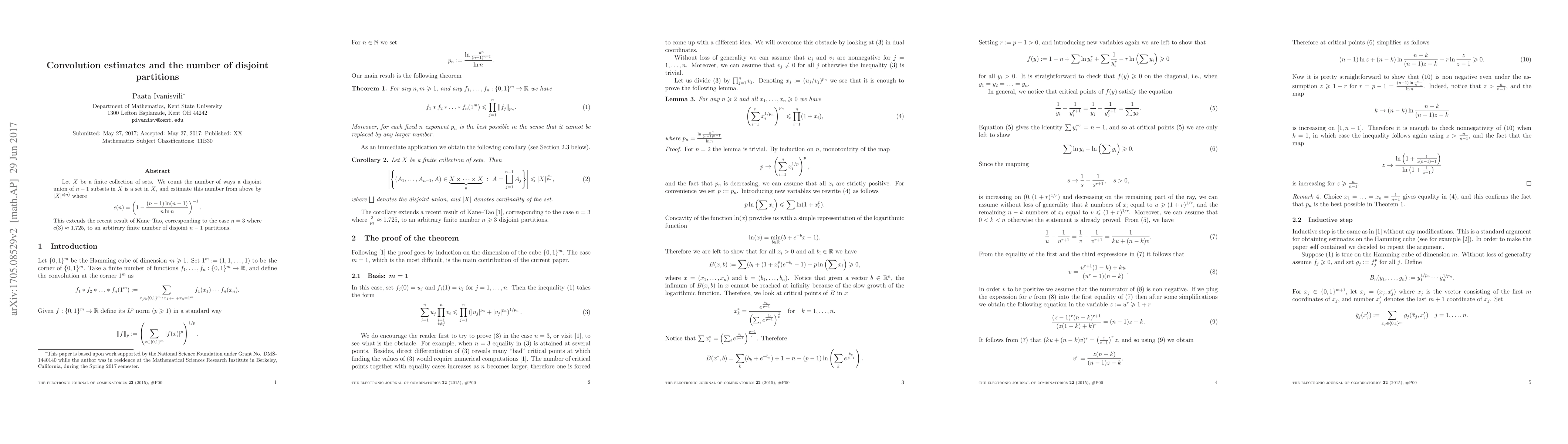 This paper estimates the number of ways to form disjoint unions of $n-1$ subsets from a finite collection $X$, providing an upper bound of $|X|^{c(n)}$ where $c(n)$ is a function derived from logarithmic ratios. The result generalizes the earlier work of Kane and Tao for $n=3$ to any finite $n$.
