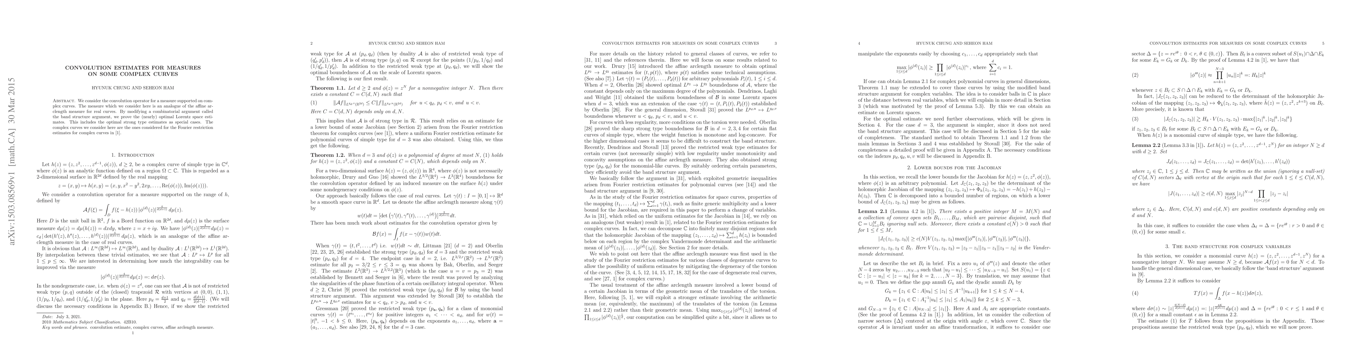 This paper investigates convolution estimates for a measure on complex curves, analogous to the affine arclength measure for real curves, and proves nearly optimal Lorentz space estimates using a modified combinatorial argument. The results include optimal strong type estimates and apply to complex curves relevant for Fourier restriction estimates.