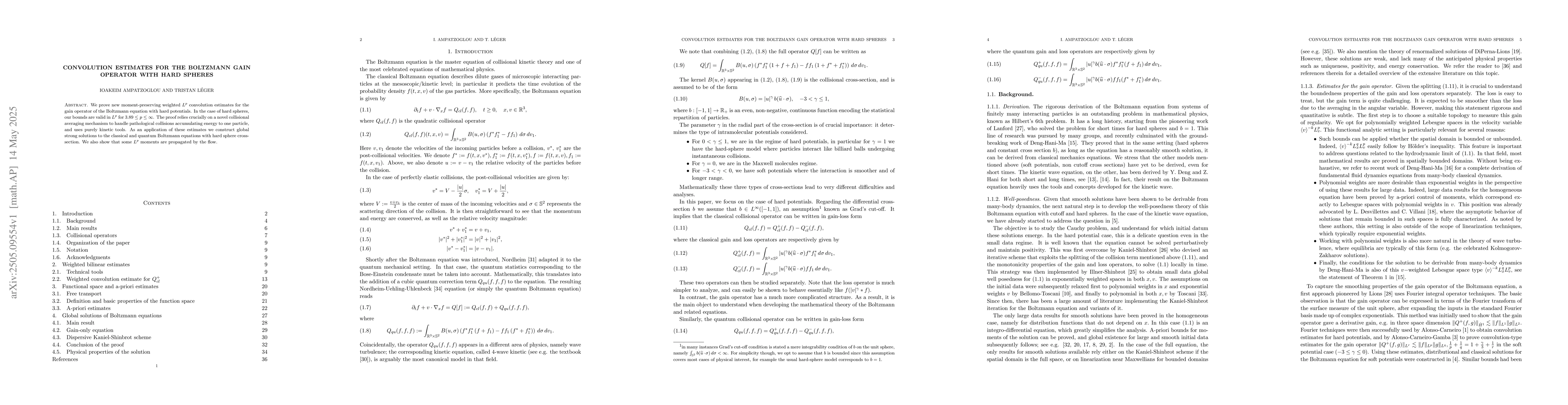 Researchers develop new convolution estimates for the Boltzmann gain operator with hard spheres, providing bounds in $L^p$ spaces for 3.89 >q p > infinity and enabling global strong solutions to classical and quantum Boltzmann equations.