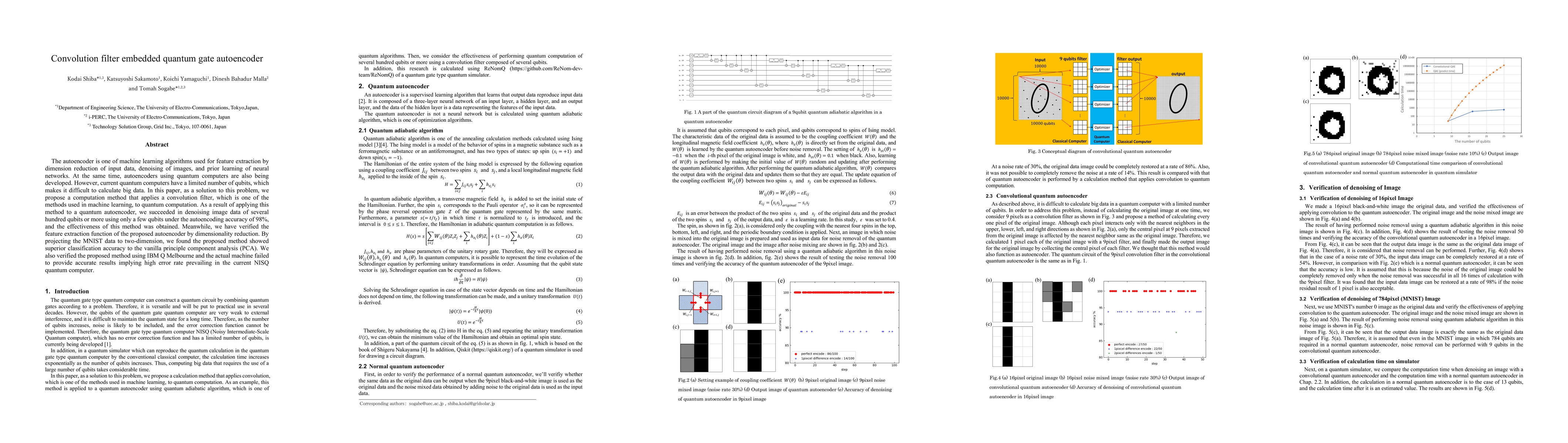 The autoencoder is one of machine learning algorithms used for feature extraction by dimension reduction of input data, denoising of images, and prior learning of neural networks. At the same time, autoencoders using quantum computers are also being developed. However, current quantum computers have a limited number of qubits, which makes it difficult to calculate big data. In this paper, as a solution to this problem, we propose a computation method that applies a convolution filter, which is one of the methods used in machine learning, to quantum computation. As a result of applying this method to a quantum autoencoder, we succeeded in denoising image data of several hundred qubits or more using only a few qubits under the autoencoding accuracy of 98%, and the effectiveness of this method was obtained. Meanwhile, we have verified the feature extraction function of the proposed autoencoder by dimensionality reduction. By projecting the MNIST data to two-dimension, we found the proposed method showed superior classification accuracy to the vanilla principle component analysis (PCA). We also verified the proposed method using IBM Q Melbourne and the actual machine failed to provide accurate results implying high error rate prevailing in the current NISQ quantum computer.