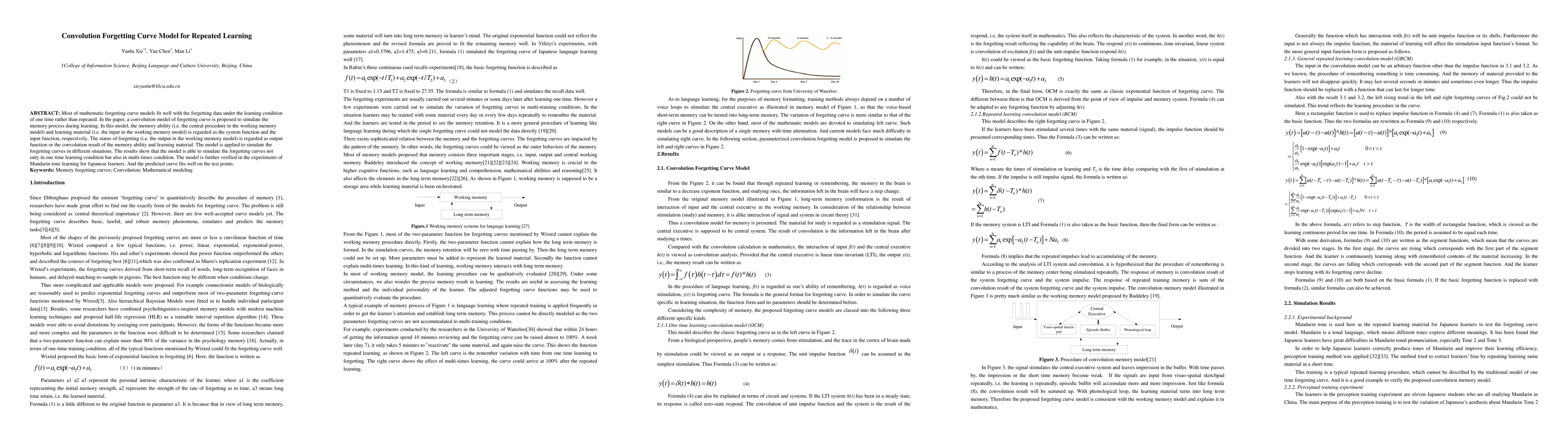 Most of mathematic forgetting curve models fit well with the forgetting data under the learning condition of one time rather than repeated. In the paper, a convolution model of forgetting curve is proposed to simulate the memory process during learning. In this model, the memory ability (i.e. the central procedure in the working memory model) and learning material (i.e. the input in the working memory model) is regarded as the system function and the input function, respectively. The status of forgetting (i.e. the output in the working memory model) is regarded as output function or the convolution result of the memory ability and learning material. The model is applied to simulate the forgetting curves in different situations. The results show that the model is able to simulate the forgetting curves not only in one time learning condition but also in multi-times condition. The model is further verified in the experiments of Mandarin tone learning for Japanese learners. And the predicted curve fits well on the test points.
