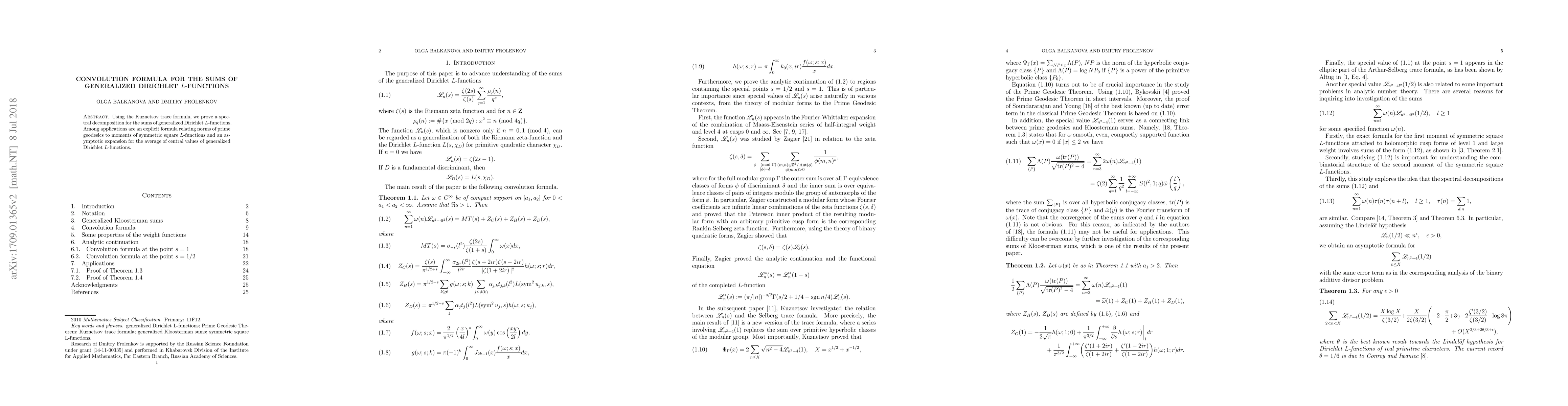 Using the Kuznetsov trace formula, we prove a spectral decomposition for the sums of generalized Dirichlet $L$-functions. Among applications are an explicit formula relating norms of prime geodesics to moments of symmetric square $L$-functions and an asymptotic expansion for the average of central values of generalized Dirichlet $L$-functions.