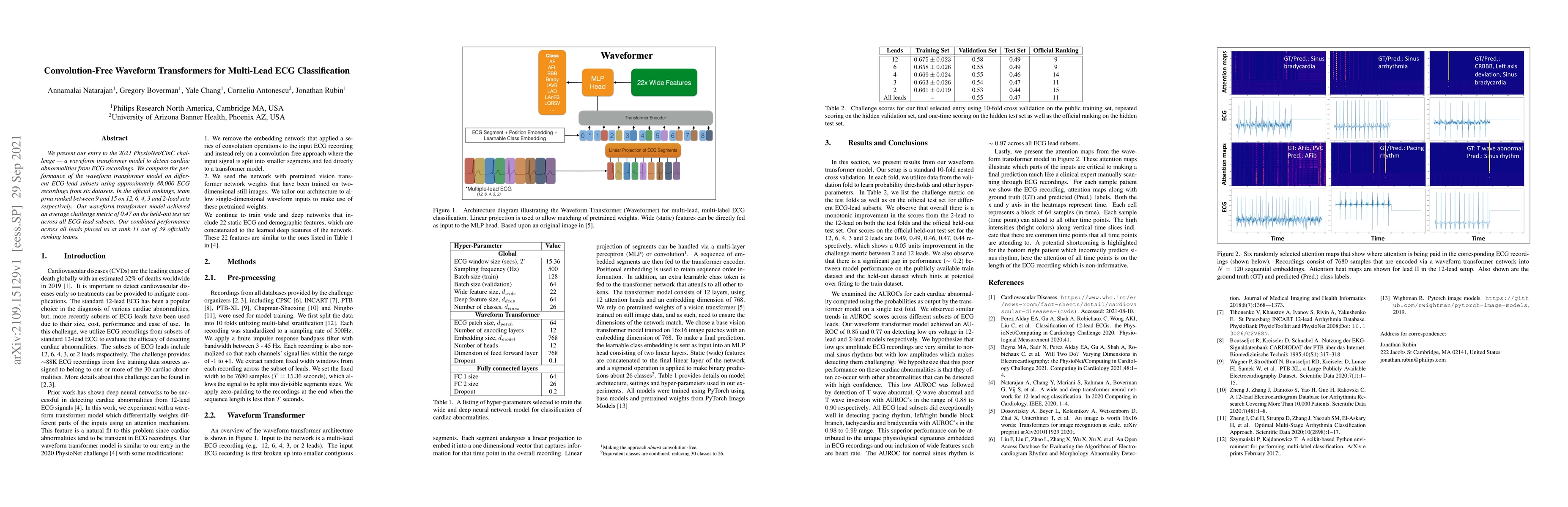 This paper introduces a convolution-free waveform transformer model for detecting cardiac abnormalities from multi-lead ECG recordings, achieving an average challenge metric of 0.47 on a test set. The model's performance was evaluated across various ECG-lead subsets, ranking between 9 and 11 among 39 competing teams.