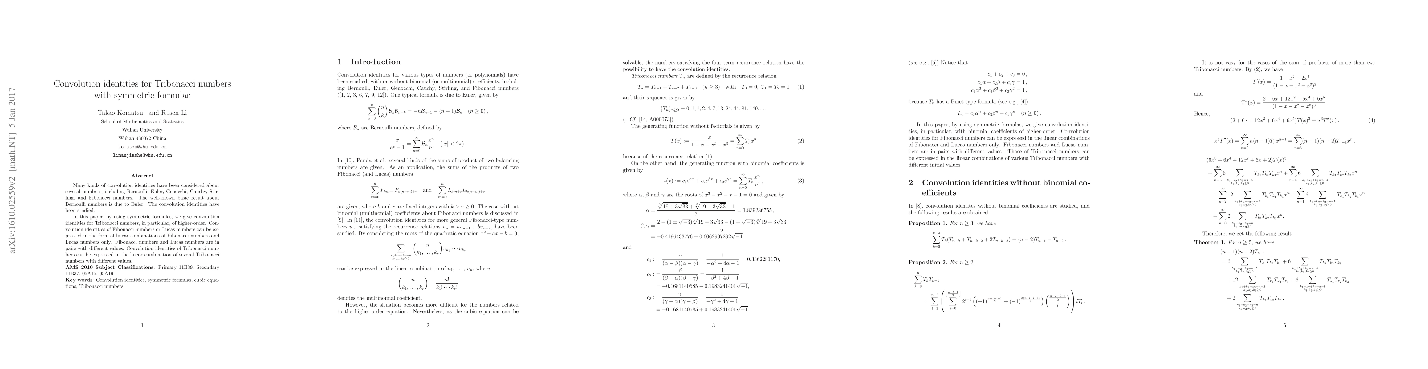 This paper presents convolution identities for Tribonacci numbers, both with and without binomial coefficients, expressing these identities as linear combinations of different Tribonacci numbers, using symmetric formulas as a fundamental tool. Unlike Fibonacci or Lucas numbers, Tribonacci convolution identities involve several distinct Tribonacci numbers.