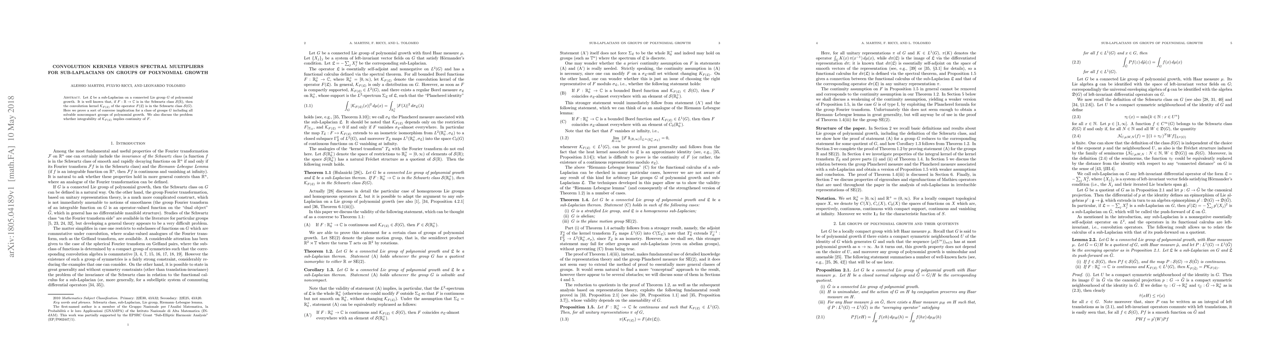 Let $\mathcal{L}$ be a sub-Laplacian on a connected Lie group $G$ of polynomial growth. It is well known that, if $F : \mathbb{R} \to \mathbb{C}$ is in the Schwartz class $\mathcal{S}(\mathbb{R})$, then the convolution kernel $\mathcal{K}_{F(\mathcal{L})}$ of the operator $F(\mathcal{L})$ is in the Schwartz class $\mathcal{S}(G)$. Here we prove a sort of converse implication for a class of groups $G$ including all solvable noncompact groups of polynomial growth. We also discuss the problem whether integrability of $\mathcal{K}_{F(\mathcal{L})}$ implies continuity of $F$.