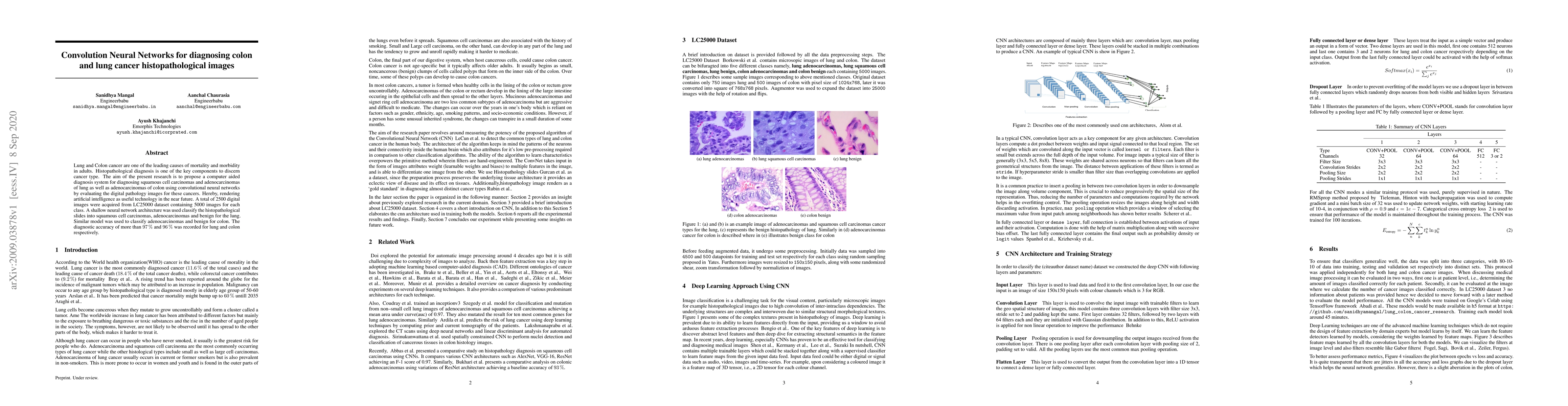 This research proposes a convolutional neural network (CNN) system for diagnosing lung and colon adenocarcinomas using digital histopathological images. The model achieved over 97% accuracy for lung cancer and 96% for colon cancer, demonstrating the potential of AI in aiding cancer diagnosis.