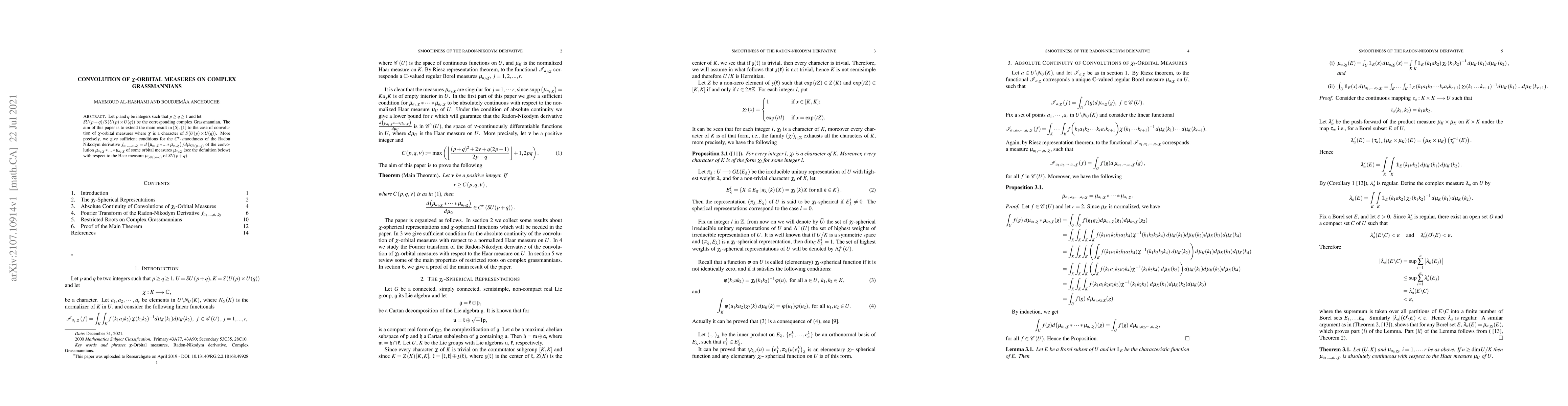 The paper introduces and utilizes a Fourier transform approach to analyze the smoothness of Radon-Nikodym derivatives for convolutions of χ-orbital measures on complex Grassmannians, extending previous work to characters of S(U(p)×U(q)).