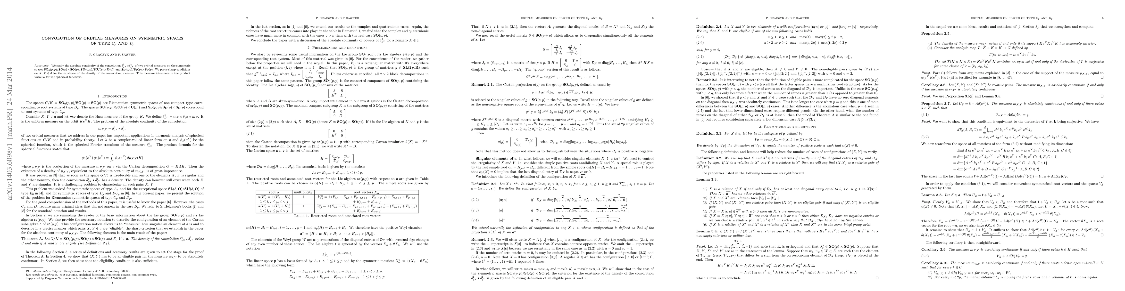 This paper investigates the absolute continuity and density conditions for the convolution of orbital measures on symmetric spaces of types $C_p$ and $D_p$, specifically on ${\bf SO}_0(p,p)/{\bf SO}(p)\times{\bf SO}(p)$, $\SU(p,p)/{\bf S}({\bf U}(p)\times{\bf U}(p))$, and $\Sp(p,p)/{\bf Sp }(p)\times\Sp(p)$. It establishes sharp criteria for the existence of a density for the convolution, which is crucial for the product formula of spherical functions.
