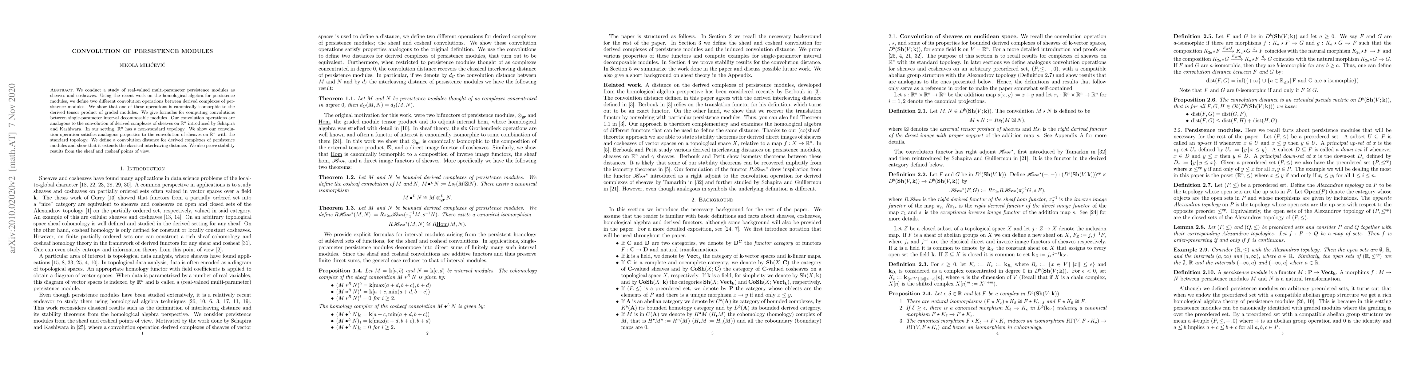 The paper defines and studies two convolution operations on derived categories of persistence modules, linking sheaf and cosheaf theories to homological algebra of graded modules.