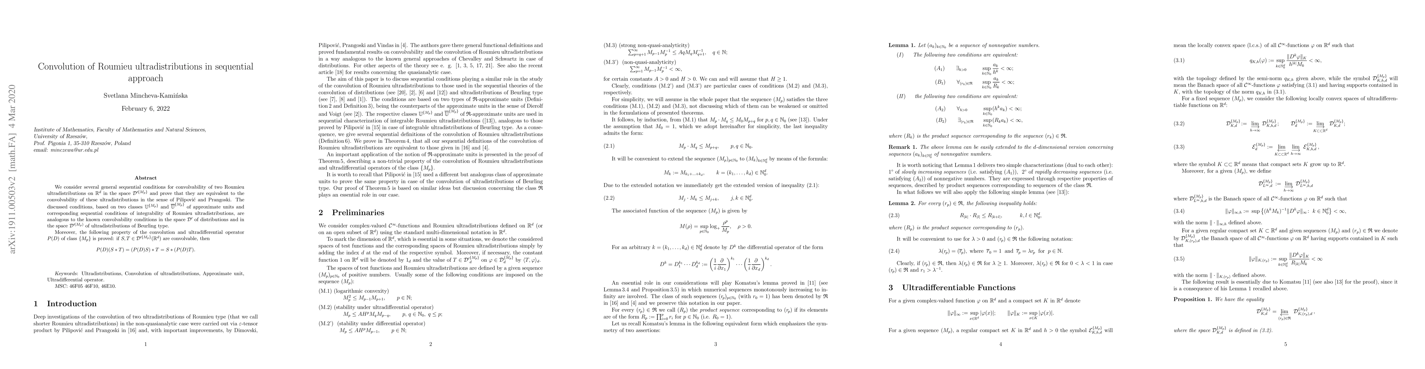 This paper establishes sequential conditions for the convolution of two Roumieu ultradistributions, proving their equivalence to the convolution in the sense of Pilipovic and Prangoskí. It also introduces analogous conditions based on approximate units and sequential integrability, and proves a useful property of the convolution and ultradiferential operator.