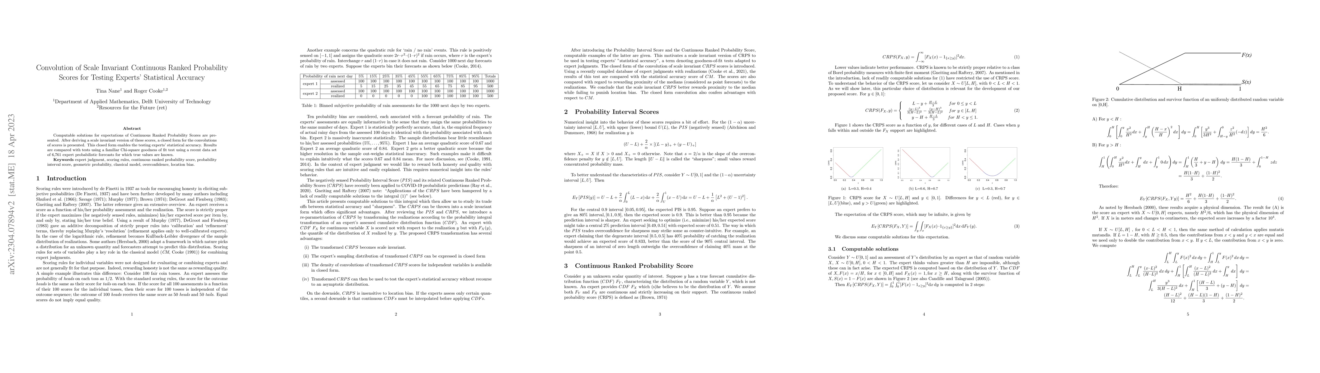Computable solutions for expectations of Continuous Ranked Probability Scores are presented. After deriving a scale invariant version of these scores, a closed form for the convolutions of scores is presented. This closed form enables the testing experts' statistical accuracy. Results are compared with tests using a familiar Chi-square goodness of fit test using a recent data set of 6,761 expert probabilistic forecasts for which true values are known.