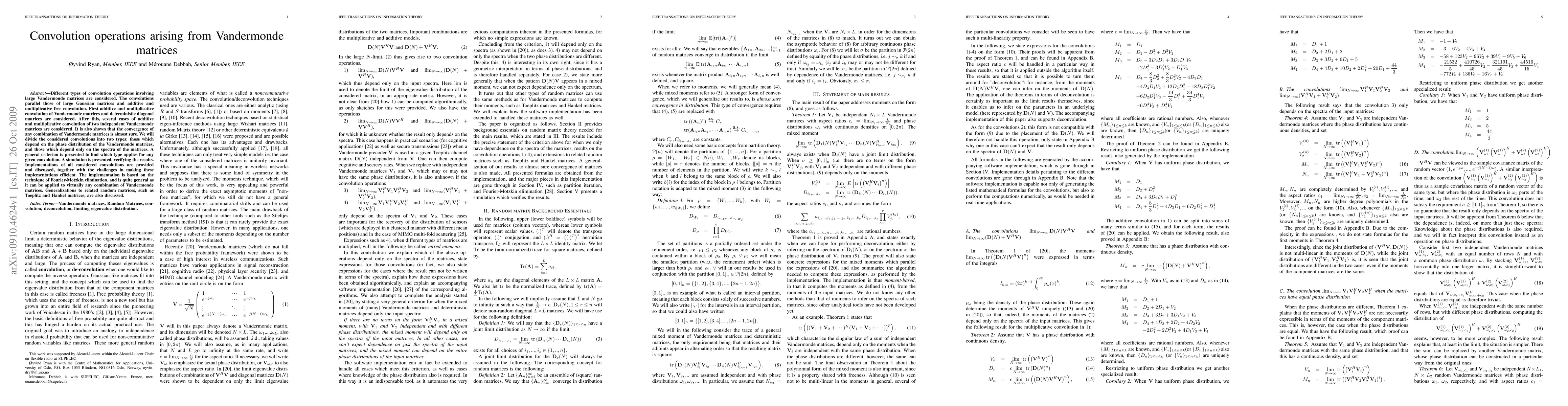 This paper explores convolution operations involving large Vandermonde matrices, comparing them to Gaussian matrices and free convolution. It examines both additive and multiplicative convolutions, proving almost sure convergence and presenting a criterion to classify convolutions based on phase distribution or spectra. Implementations using Fourier-Motzkin elimination and generalizations to Toeplitz and Hankel matrices are also discussed.