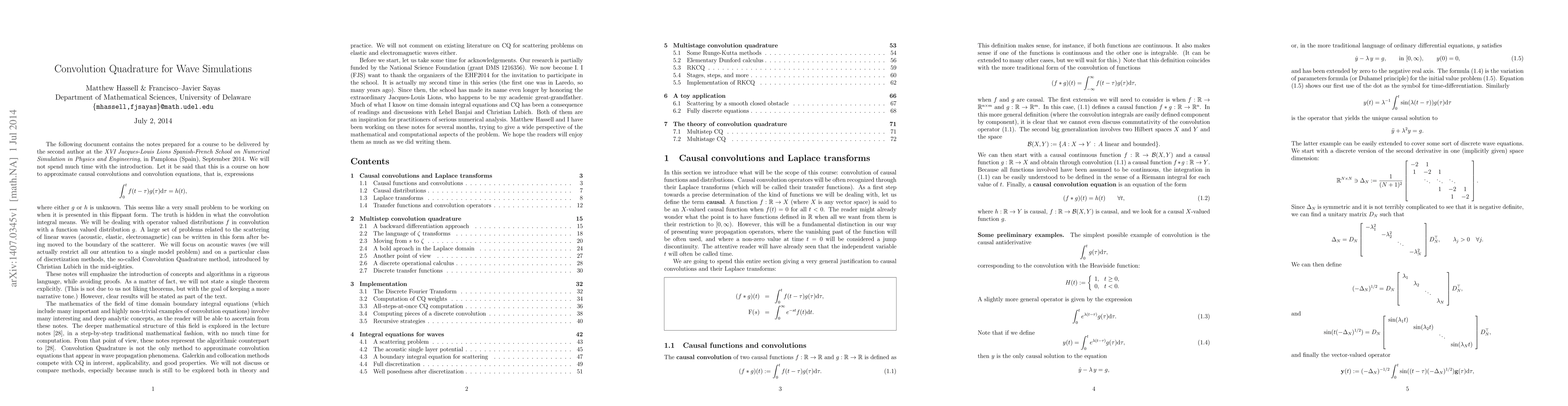 Summary: This paper introduces Convolution Quadrature techniques for solving linear convolutions and equations, particularly focusing on wave propagation problems. It covers algorithmic aspects, vector-valued distributions, and Dunford calculus in a self-contained manner.