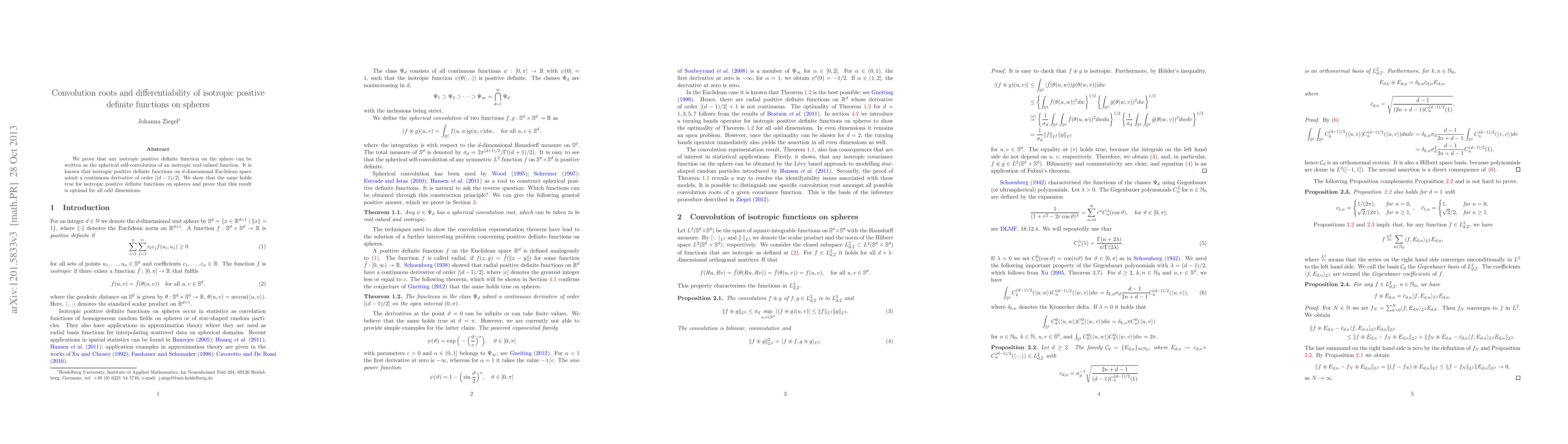 Summary: This paper demonstrates that isotropic positive definite functions on spheres can be expressed as the spherical self-convolution of an isotropic real-valued function. It also proves the continuity of the function's derivative up to order [(d-1)/2] for odd dimensions, establishing this result as optimal.
