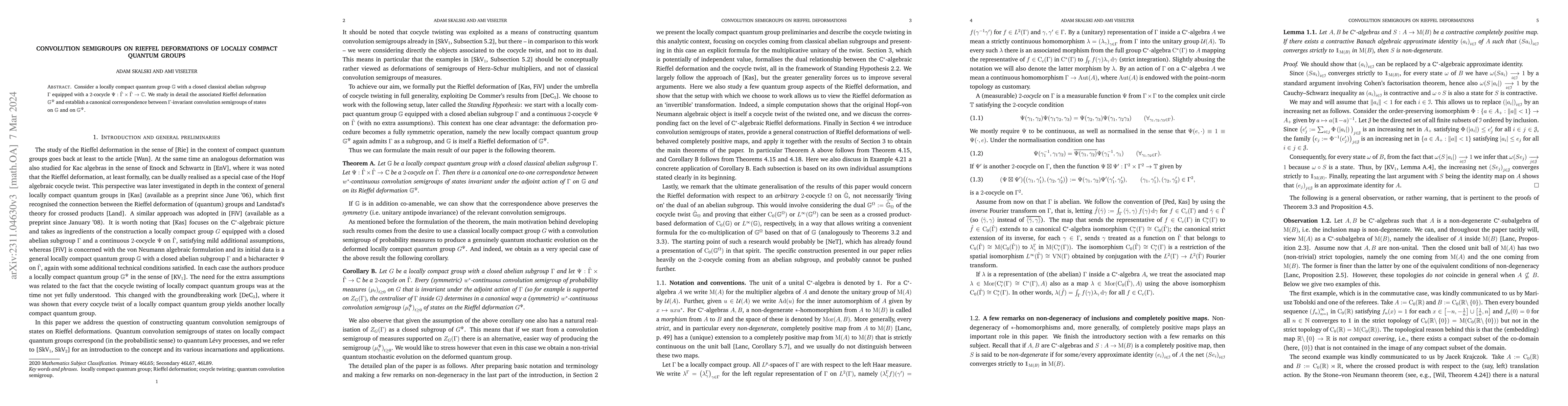 Consider a locally compact quantum group $\mathbb{G}$ with a closed classical abelian subgroup $\Gamma$ equipped with a $2$-cocycle $\Psi:\hat{\Gamma}\times\hat{\Gamma}\to\mathbb{C}$. We study in detail the associated Rieffel deformation $\mathbb{G}^{\Psi}$ and establish a canonical correspondence between $\Gamma$-invariant convolution semigroups of states on $\mathbb{G}$ and on $\mathbb{G}^{\Psi}$.
