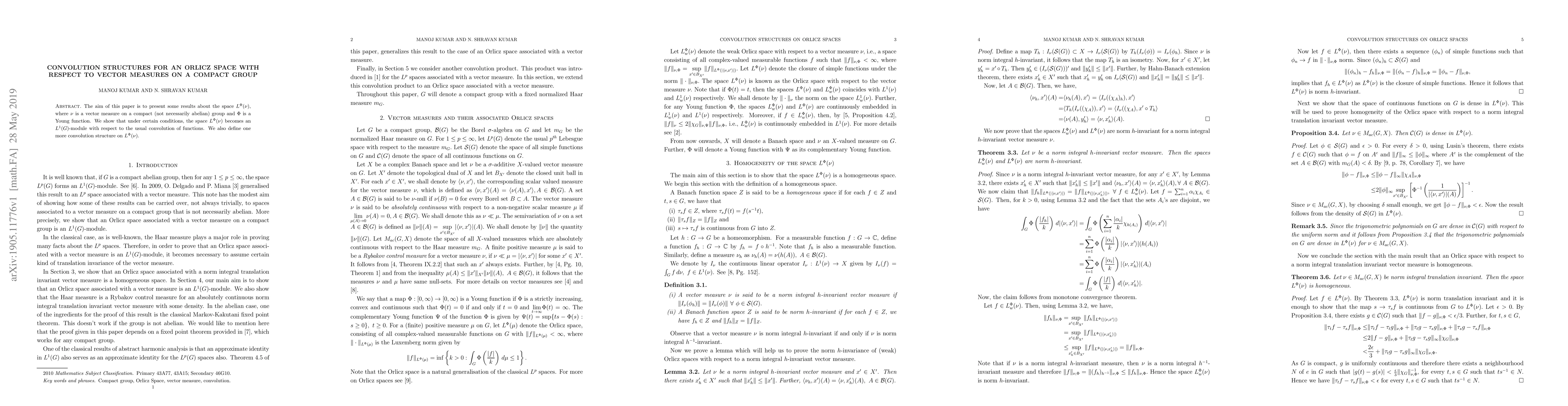This paper explores convolution structures on L^ ho( u), where u is a vector measure on a compact group and ho is a Young function, showing that the space becomes an L^1(G)-module under certain conditions.