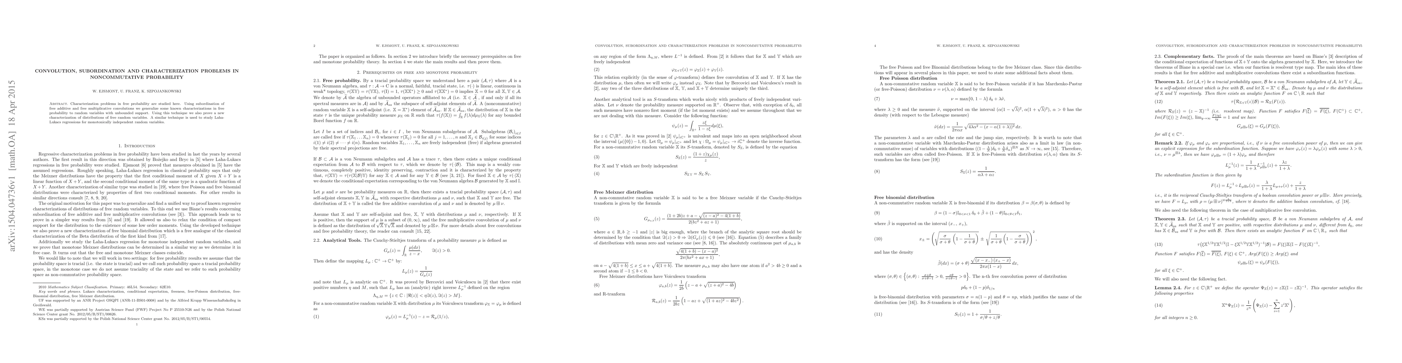 Characterization problems in free probability are studied here. Using subordination of free additive and free multiplicative convolutions we generalize some known characterizations in free probability to random variables with unbounded support. Using this technique we also prove a new characterization of distributions of free random variables. A similar technique is used to study Laha-Lukacs regressions for monotonically independent random variables.