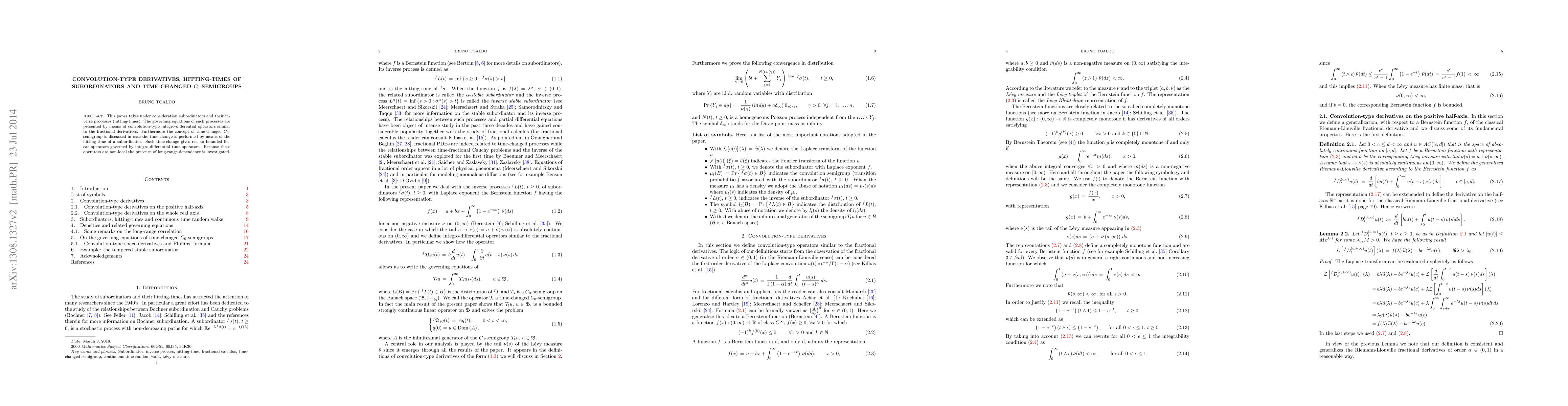 This paper explores convolution-type derivatives of subordinators and their hitting times, revealing governing equations that describe non-local operators with potential long-range dependence.