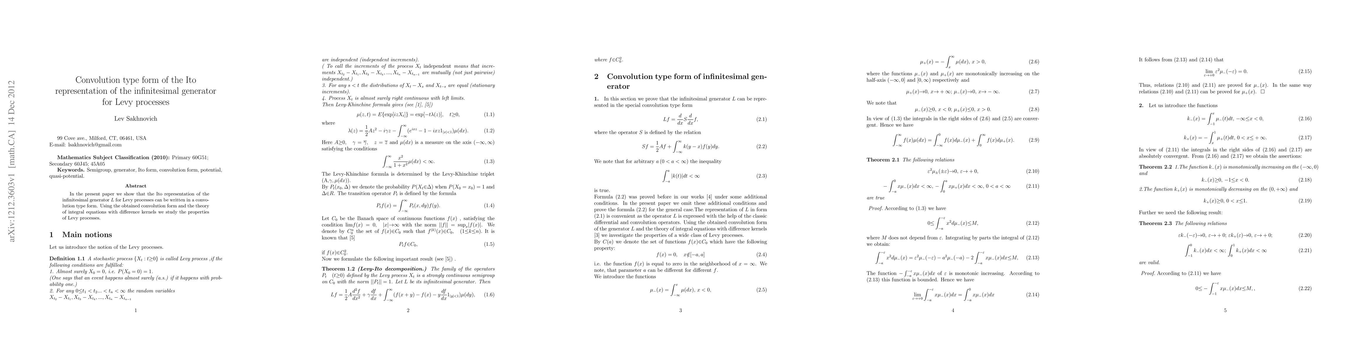 Summary: This paper demonstrates a convolution type form of the Ito representation for the infinitesimal generator of Lévy processes and utilizes this form, along with integral equation theory, to investigate the properties of Lévy processes.