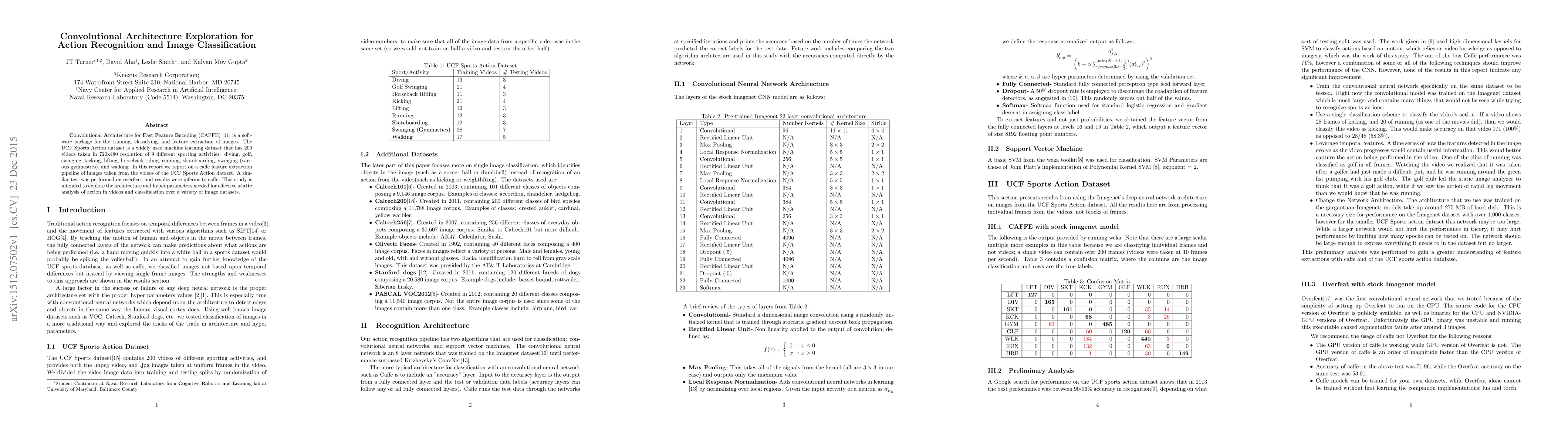 This study explores the effectiveness of Convolutional Architecture for Fast Feature Encoding (CAFFE) in action recognition and image classification using the UCF Sports Action dataset, outperforming a similar test on Overfeat.