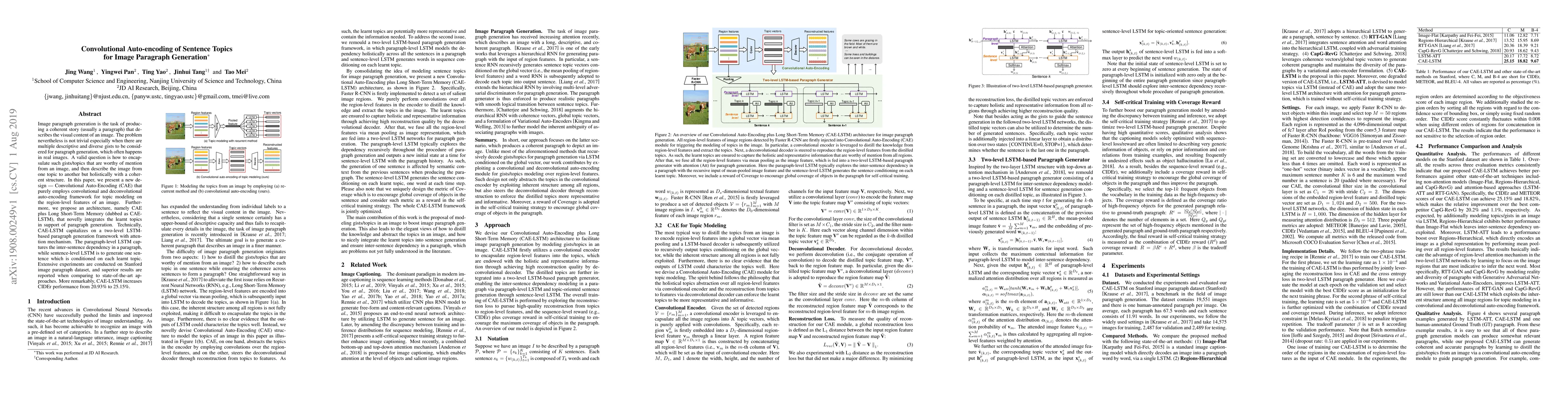 This paper introduces a Convolutional Auto-Encoding (CAE) framework for modeling image topics and a CAE-LSTM architecture for generating coherent image paragraphs. Experiments on the Stanford dataset show CAE-LSTM significantly improves paragraph generation performance, increasing CIDEr scores by 4.22%.