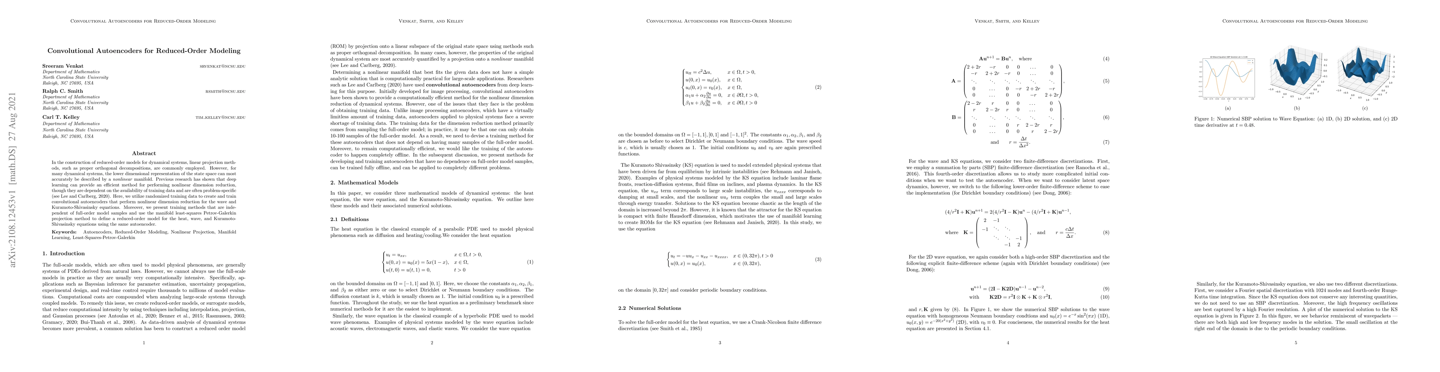 In the construction of reduced-order models for dynamical systems, linear projection methods, such as proper orthogonal decompositions, are commonly employed. However, for many dynamical systems, the lower dimensional representation of the state space can most accurately be described by a \textit{nonlinear} manifold. Previous research has shown that deep learning can provide an efficient method for performing nonlinear dimension reduction, though they are dependent on the availability of training data and are often problem-specific \citep[see][]{carlberg_ca}. Here, we utilize randomized training data to create and train convolutional autoencoders that perform nonlinear dimension reduction for the wave and Kuramoto-Shivasinsky equations. Moreover, we present training methods that are independent of full-order model samples and use the manifold least-squares Petrov-Galerkin projection method to define a reduced-order model for the heat, wave, and Kuramoto-Shivasinsky equations using the same autoencoder.