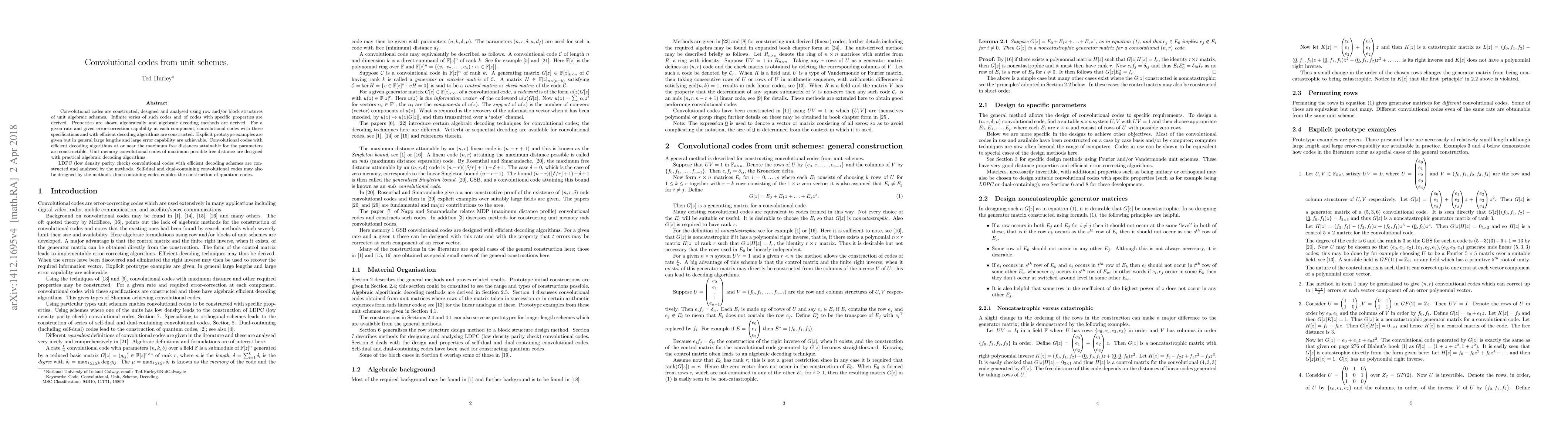 This paper constructs convolutional codes using algebraic structures from unit schemes, deriving infinite series of codes with specific properties and efficient decoding methods. The study focuses on achieving maximum free distances and practical decoding algorithms, including the construction of LDPC and self-dual codes, with applications to quantum codes.