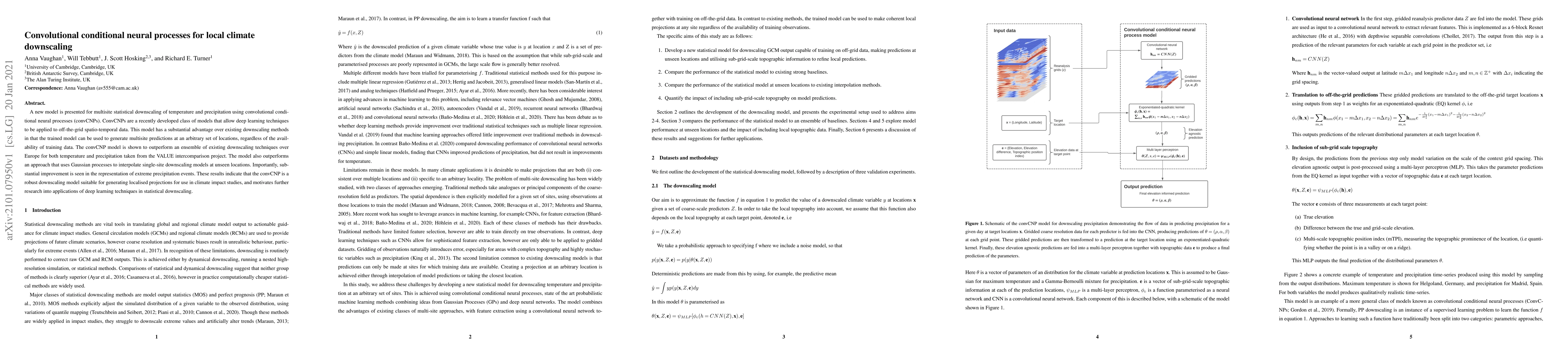 This paper introduces convolutional conditional neural processes (convCNPs) for multisite statistical downscaling of temperature and precipitation, demonstrating superior performance over existing methods, especially in representing extreme precipitation events. The model's ability to generate predictions at any location enhances its utility for climate impact studies.
