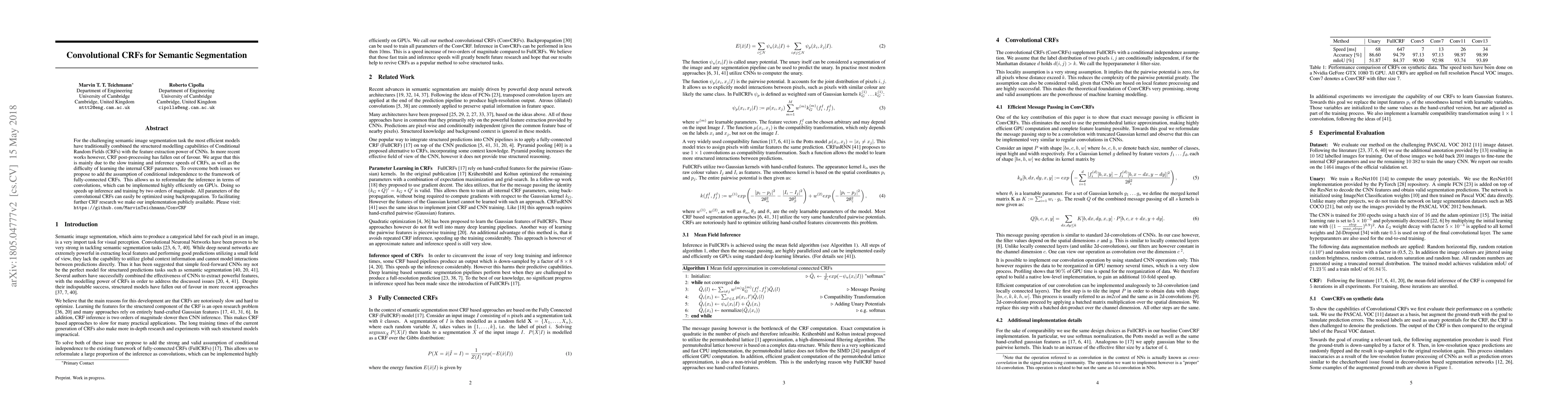 The paper introduces an efficient implementation of message passing in CRFs as convolutions, significantly speeding up training and inference while allowing for backpropagation.
