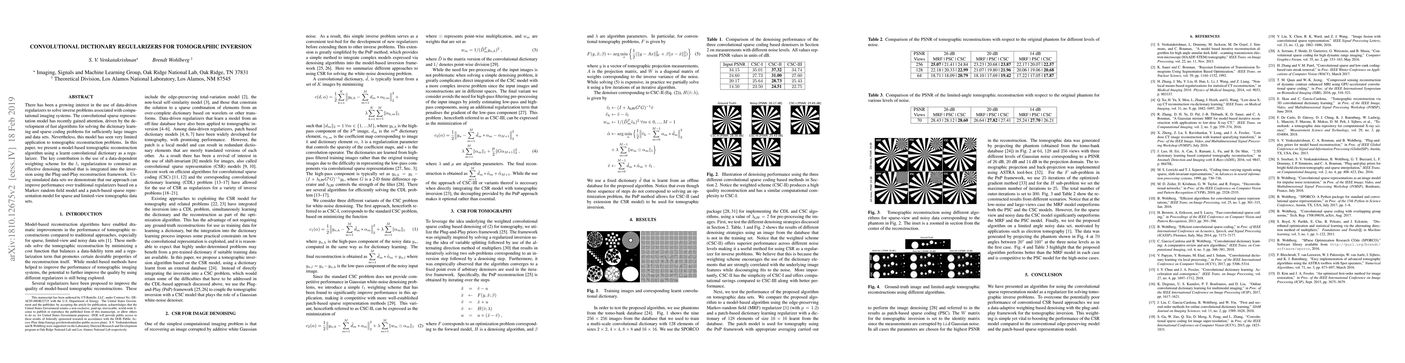 This paper proposes a convolutional dictionary regularizer for tomographic inversion, utilizing a learned convolutional dictionary within a Plug-and-Play reconstruction framework. The method employs a data-dependent weighting scheme for l1 regularization, demonstrating improved performance over traditional regularizers on simulated sparse and limited-view tomographic data sets.