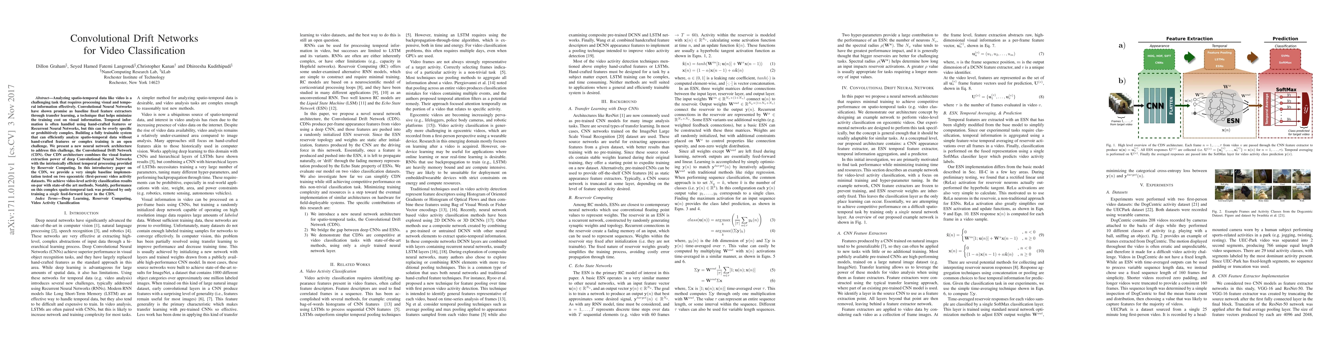The Convolutional Drift Network (CDN) combines Convolutional Neural Networks for visual feature extraction with Reservoir Computing for efficient temporal processing, achieving state-of-the-art results in video classification with minimal training complexity.