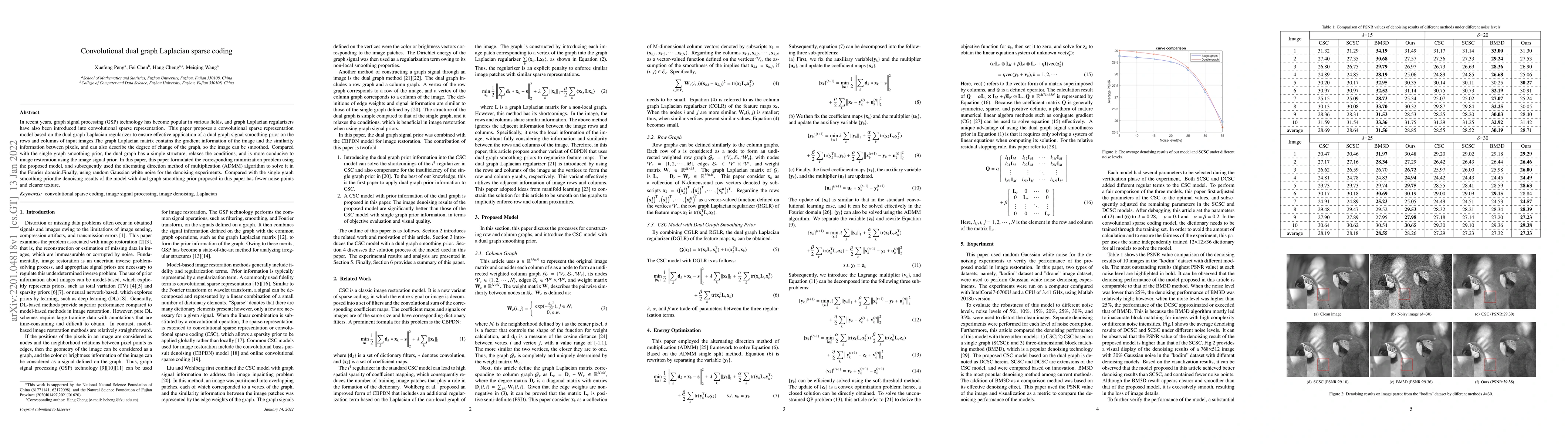 In recent years, graph signal processing (GSP) technology has become popular in various fields, and graph Laplacian regularizers have also been introduced into convolutional sparse representation. This paper proposes a convolutional sparse representation model based on the dual graph Laplacian regularizer to ensure effective application of a dual graph signal smoothing prior on the rows and columns of input images.The graph Laplacian matrix contains the gradient information of the image and the similarity information between pixels, and can also describe the degree of change of the graph, so the image can be smoothed. Compared with the single graph smoothing prior, the dual graph has a simple structure, relaxes the conditions, and is more conducive to image restoration using the image signal prior. In this paper, this paper formulated the corresponding minimization problem using the proposed model, and subsequently used the alternating direction method of multiplication (ADMM) algorithm to solve it in the Fourier domain.Finally, using random Gaussian white noise for the denoising experiments. Compared with the single graph smoothing prior,the denoising results of the model with dual graph smoothing prior proposed in this paper has fewer noise points and clearer texture.