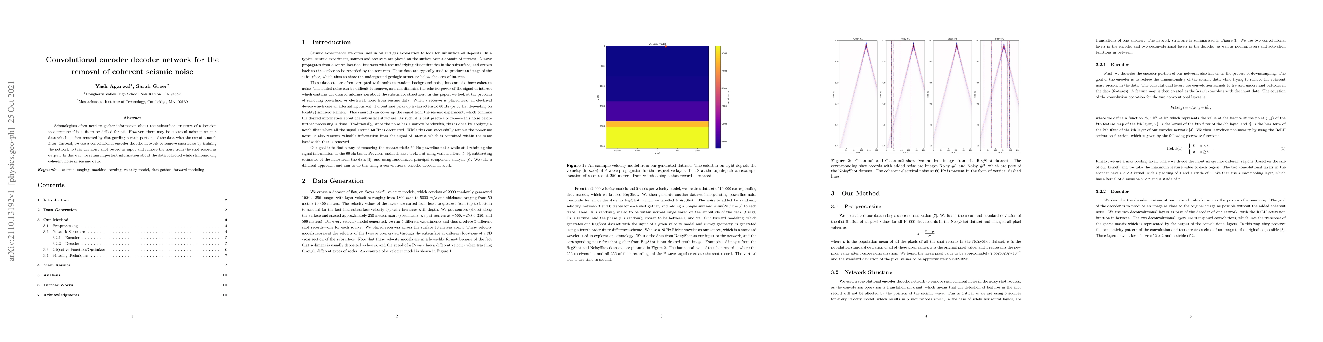 Seismologists often need to gather information about the subsurface structure of a location to determine if it is fit to be drilled for oil. However, there may be electrical noise in seismic data which is often removed by disregarding certain portions of the data with the use of a notch filter. Instead, we use a convolutional encoder decoder network to remove such noise by training the network to take the noisy shot record as input and remove the noise from the shot record as output. In this way, we retain important information about the data collected while still removing coherent noise in seismic data.