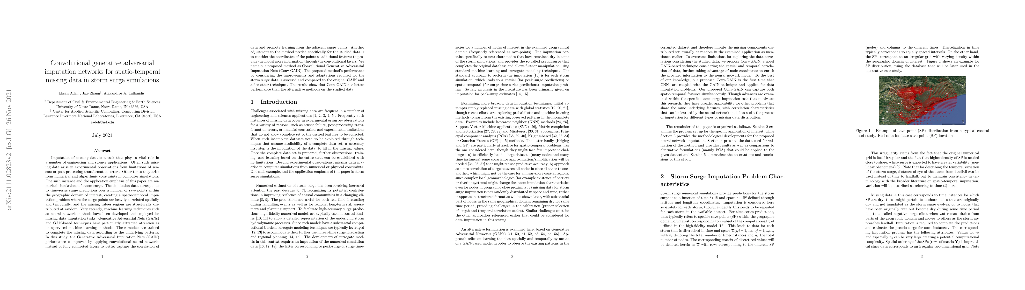 This paper proposes Convolutional Generative Adversarial Imputation Nets (Conv-GAIN) to address spatio-temporal missing data in storm surge simulations, utilizing convolutional neural networks to better capture spatial and temporal correlations. The method outperforms original GAIN and other techniques in imputing the missing surge data.
