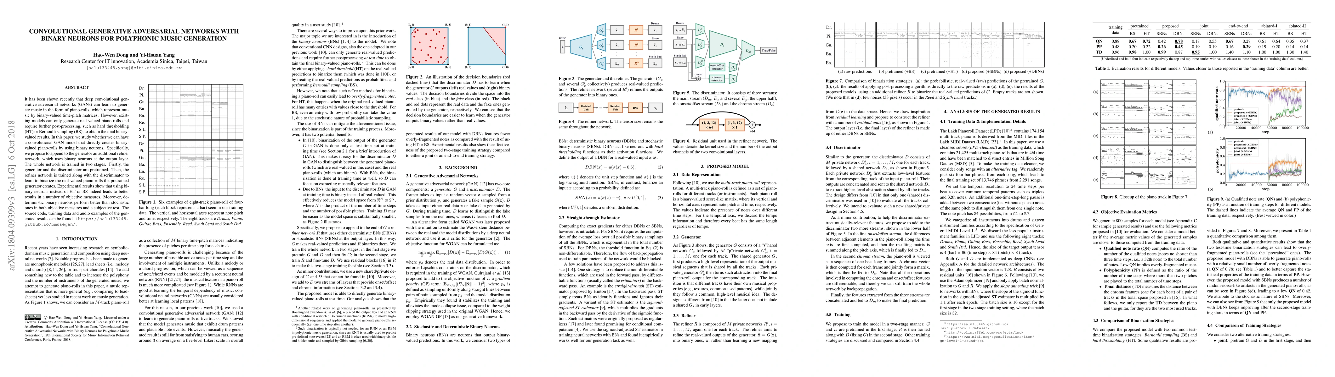 This paper proposes a convolutional GAN model with binary neurons to directly generate binary-valued piano-rolls for polyphonic music, eliminating the need for post-processing. The model includes a refiner network with binary neurons, trained in two stages, achieving better results than traditional methods in both objective and subjective measures.