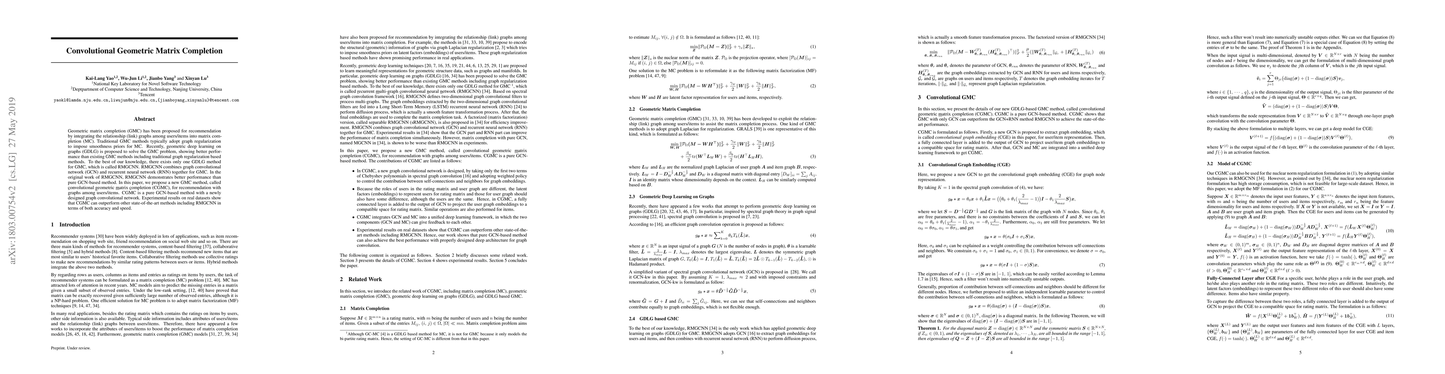 This paper proposes a new method called convolutional geometric matrix completion (CGMC) for recommendation systems by leveraging graph convolutional networks (GCNs). CGMC outperforms existing state-of-the-art methods, including the RMGCNN method, in terms of both accuracy and computational efficiency.