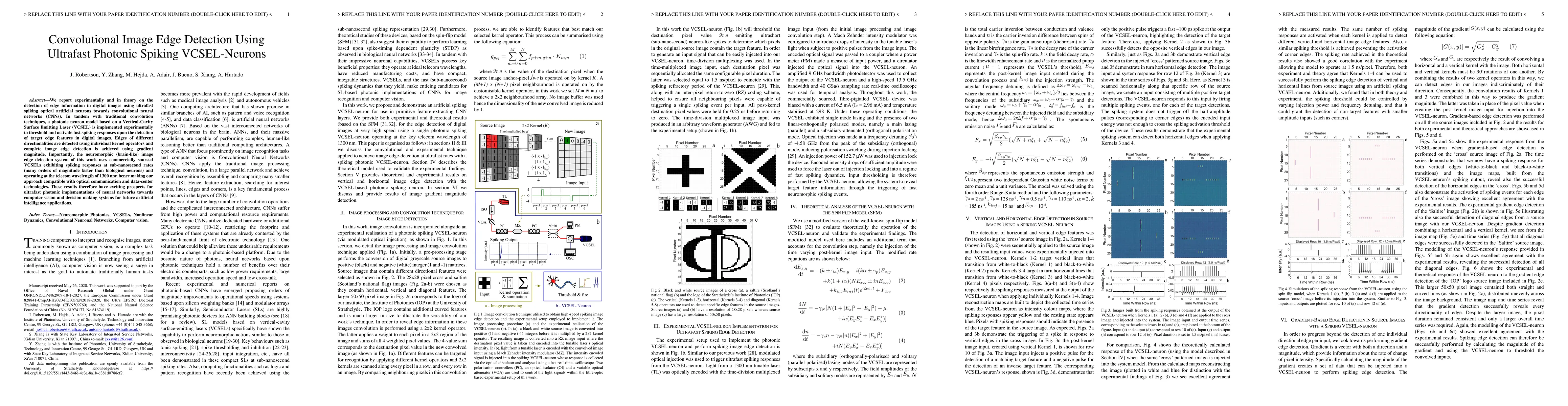 This paper presents an experimental and theoretical study on ultrafast photonic spiking neurons using Vertical-Cavity Surface Emitting Lasers (VCSELs) for convolutional edge detection in digital images, achieving speeds many orders of magnitude faster than biological neurons. The proposed neuromorphic system shows promising potential for future AI applications in computer vision and decision-making systems.