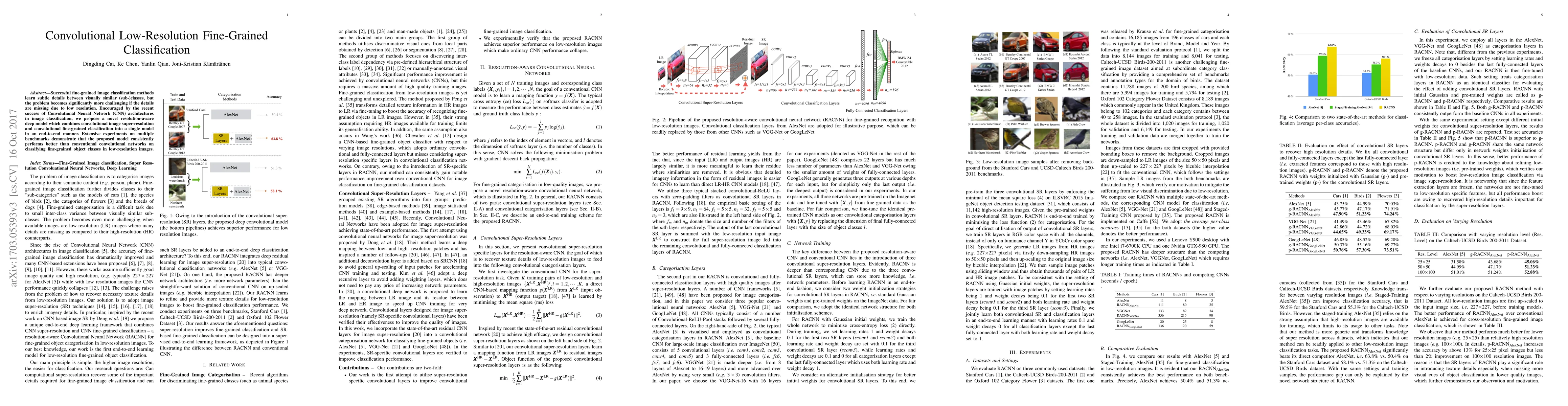 Successful fine-grained image classification methods learn subtle details between visually similar (sub-)classes, but the problem becomes significantly more challenging if the details are missing due to low resolution. Encouraged by the recent success of Convolutional Neural Network (CNN) architectures in image classification, we propose a novel resolution-aware deep model which combines convolutional image super-resolution and convolutional fine-grained classification into a single model in an end-to-end manner. Extensive experiments on the Stanford Cars and Caltech-UCSD Birds 200-2011 benchmarks demonstrate that the proposed model consistently performs better than conventional convolutional net on classifying fine-grained object classes in low-resolution images.